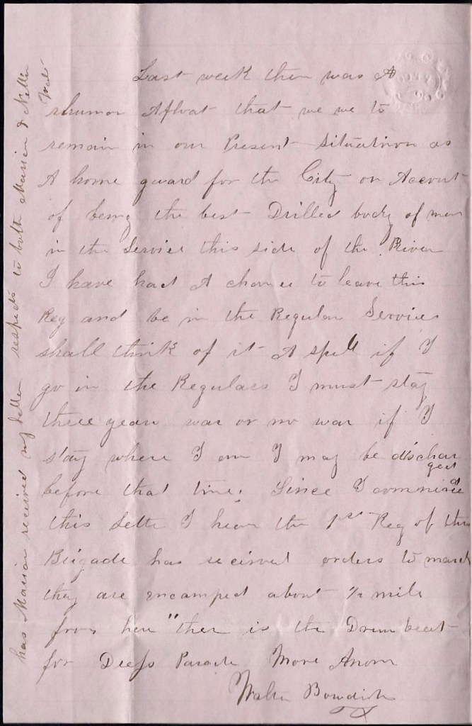 Since I commenced this letter I hear the 1st Regiment of the Brigade has received orders to march. They are encamped about half a mile from here. There is the drum beat for dress parade. More Anon. — Walter Bowdish