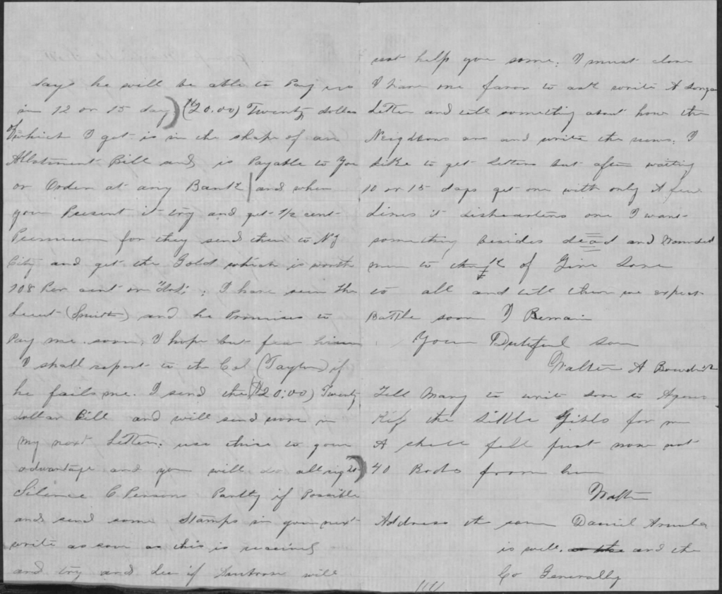 At 8 o’clock we returned to camp, found the Pay Master and got two months pay. This morning we were mustered in for two months more and the pay master says he will be able to pay us in 12 or 15 days. ($20) twenty dollars of which I got is in the shape of an Allotment Bill and is payable to you or Order at any Bank, and when you present it, try and get half cent premium for they send them to New York City and get the gold which is worth 708 percent on the dollar. I have seen the Lieut. (Smith) and he promises to pay me soon, I hope, but fear him. I shall report to the Col. (Taylor) if he fails me. I send the $20 dollar bill and will send more in the next letter. Use them to your advantage and you will do all right…