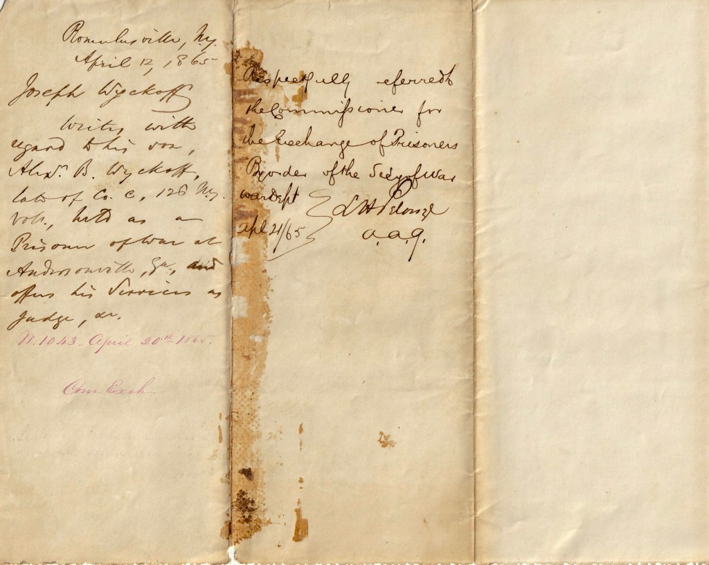 From the timing, it is unlikely that the letter ever got to Lincoln, but rather was processed by the President’s staff in the days following the assassination. The letter does, however, appear to have been read by the Secretary of War, Stanton, who Wyckoff, in his letter, implies might have been soft on corruption, though facts do not bear this out. Docketing at the end of the letter reads “W1043 April/65” (the President’s staff may have recorded correspondence alphabetically according to the last name of the writer). The letter also comes with a folded piece of ledger paper that reads “Romulusville, NY/ April 12, 1865/ Joseph Wyckoff/ Writes with regard to his son, Alex. B. Wyckoff late of Co. C. 126 NY Vol. Held as a Prisoner of War at Andersonville, Ga and offers his services as judge, etc.” On the back of the ledger paper it reads “Respectfully referred to the Commissioner for the Exchange of Prisoners By order of the Secy of War, War Dept. April 21/65 – L[ewis] H Pelouze/A.A.G.”