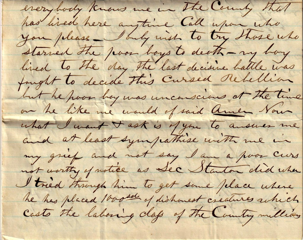 Now my boy enlisted in the service, t’will be 3 years next August. He was captured in August last 25th. He was starved to death at Andersonville but he got a parole and died at Baltimore, April 2nd instant. His Mother was with him when he died. Now, could I of stooped so low as to ask for any position during the war, I know I could of got all the principle men in our county to of signed a recommend[ation] for me as a suitable person for the position—tis no matter what [position]. But I could not—I would not—and neither would I [even if it] was it to gain the Chief Justiceship of the U. S. But I now say one thing to you, if I had the Judgeship to investigate and try those who starved those poor prisoners to death, if found guilty by evidence, I would hang every soul of them. But to stoop so low as to ask any man or any set of men to recommend me, I will never do it. But I say cursed be the man, or any set of men, that will not hang every soul that had anything to do with starving thousands of our poor boys as they have been.