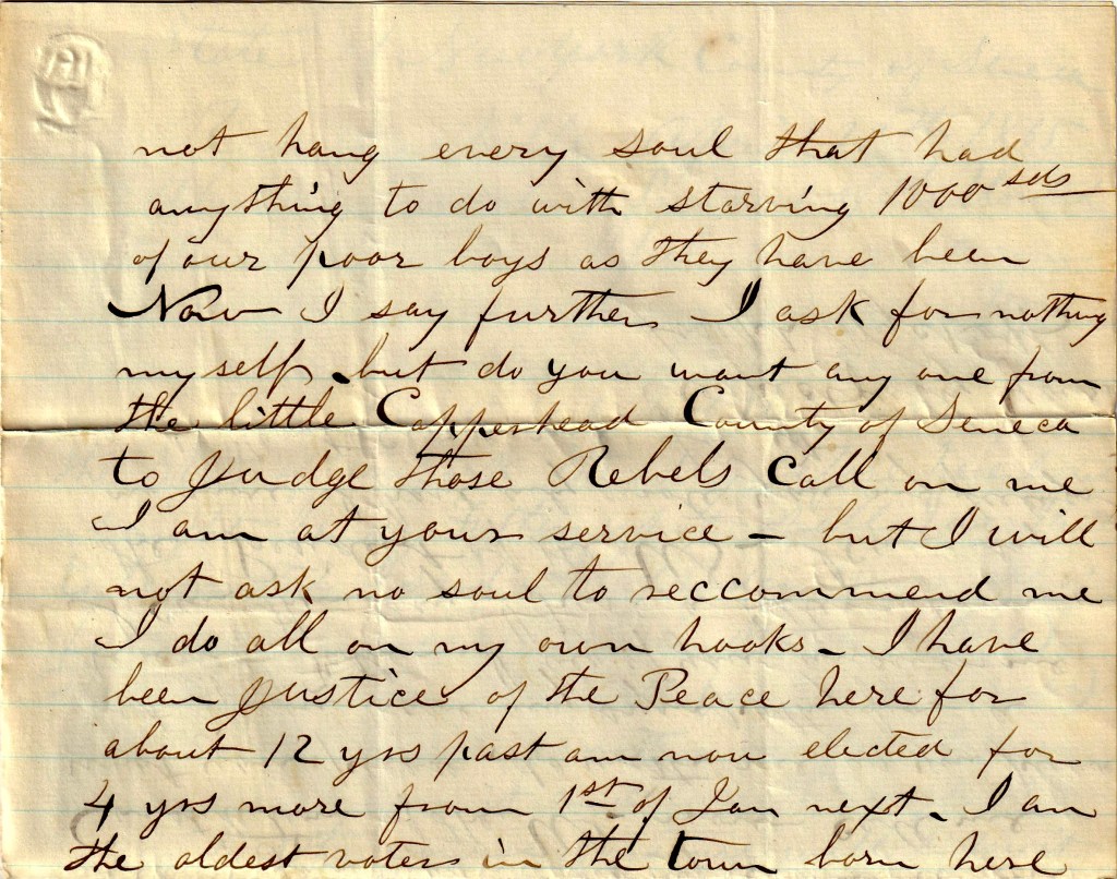 Now I say further, I ask for nothing myself, but should you want anyone from the little Copperhead County of Seneca to judge those rebels, call on me. I am at your service. But I will not ask no soul to recommend me. I do all on my own hooks. I have been Justice of the Peace here for about 12 years past, am now elected for 4 years more, from 1st of Jan next. I am the oldest voter in the town—born here—everybody knows me in the county that has lived here anytime. Call upon who you please. I only wish to try those who starved the poor boys to death. My boy lived to the day the last decisive battle was fought to decide this cursed rebellion, but the poor boy was unconscious at the time, or he—like me, would of said, Amen.