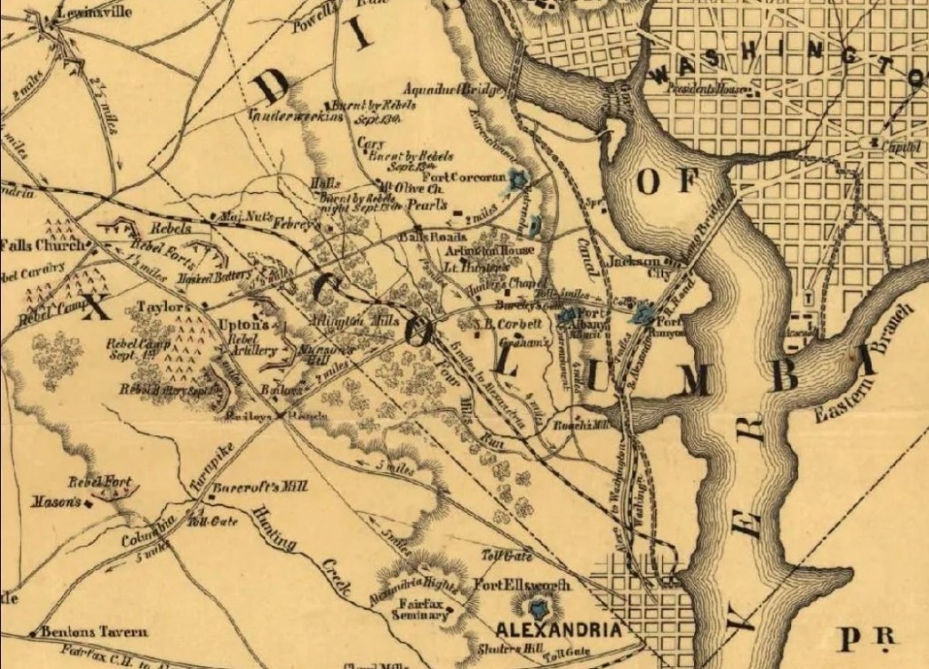 John datelined his letter from “Arlington Heights” on 5 September 1861. He indicates that the battery was near Fort Corcoran. More precisely the battery was positioned a quarter of a mile soutwest of W. Ross’ farm Rossyln.