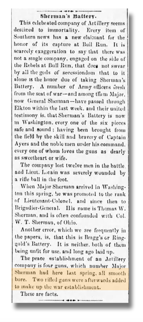 1 The celebrated Battery E of the 3rd US Regulars was led during the War with Mexico by Thomas West Sherman and it was often referred to as “Sherman’s Battery,” even when it was lead, as it was at Bull Run, by Capt. Romeyn B. Ayres. Adding greater confusion, the Battery was assigned to the command of Col. William Tecumseh Sherman just prior to the Battle of Bull Run.Ayres was at Old Point, Virginia, until 7 July 1861 when he was ordered to Washington to take command of “Sherman’s Battery.” His was the only artillery unit to save all of his guns from the battlefield and even brought off two others. Ayres was transferred to Philadelphia to recruit for the 5th US Artillery shortly afterward. [Daily National Democrat, 20 September 1861]