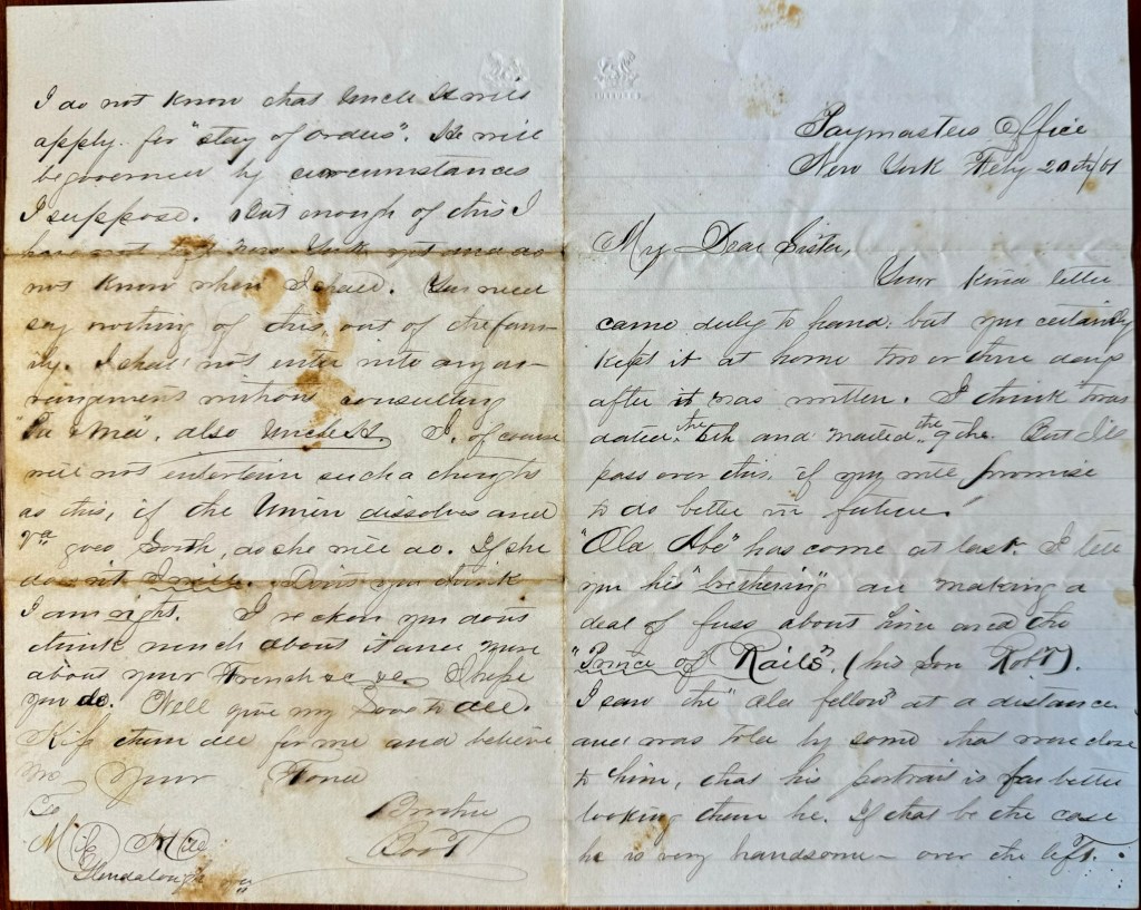 As indicated in his letter, Boot was residing in New York City before the war began, apparently employed as a clerk for his uncle, Major Henry Hill (1816-1866), who was the Army Paymaster of New York at the time. Henry’s resignation from the US Army was announced on local New York papers in June 1861 when he decided to cast his lot with the Confederacy.