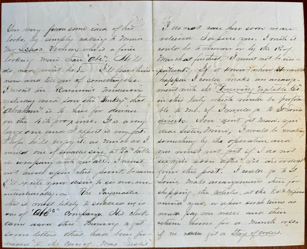 The paymaster that is most likely to succeed us is one of “Abe’s” company. His clerk came down this morning to get some letters that had been forwarded to the care of Mrs. Leslie. I do not care how soon we are relieved, I assure you. I wish it could be tomorrow or by the 1st of March at furthest. I must not be impatient. If I knew when it would happen, I could make an arrangement with the “Preserving Vegetable Co.” in this city which would be profitable to me, if I would go to St. Louis direct. Now don’t get mad, you dear sister mine, I would be making something by the operation and you must not fret if I do not see you soon after we are ordered from this post. I could go to St. Louis, make arrangements there for shipping the articles, at the company’s expense, mind you, or upon such terms as would pay me well, and then return home for a mont or so, if we get a stay of orders. I do not know that Uncle H[enry] will apply for “stay of orders.” It will be governed by circumstances, I suppose.