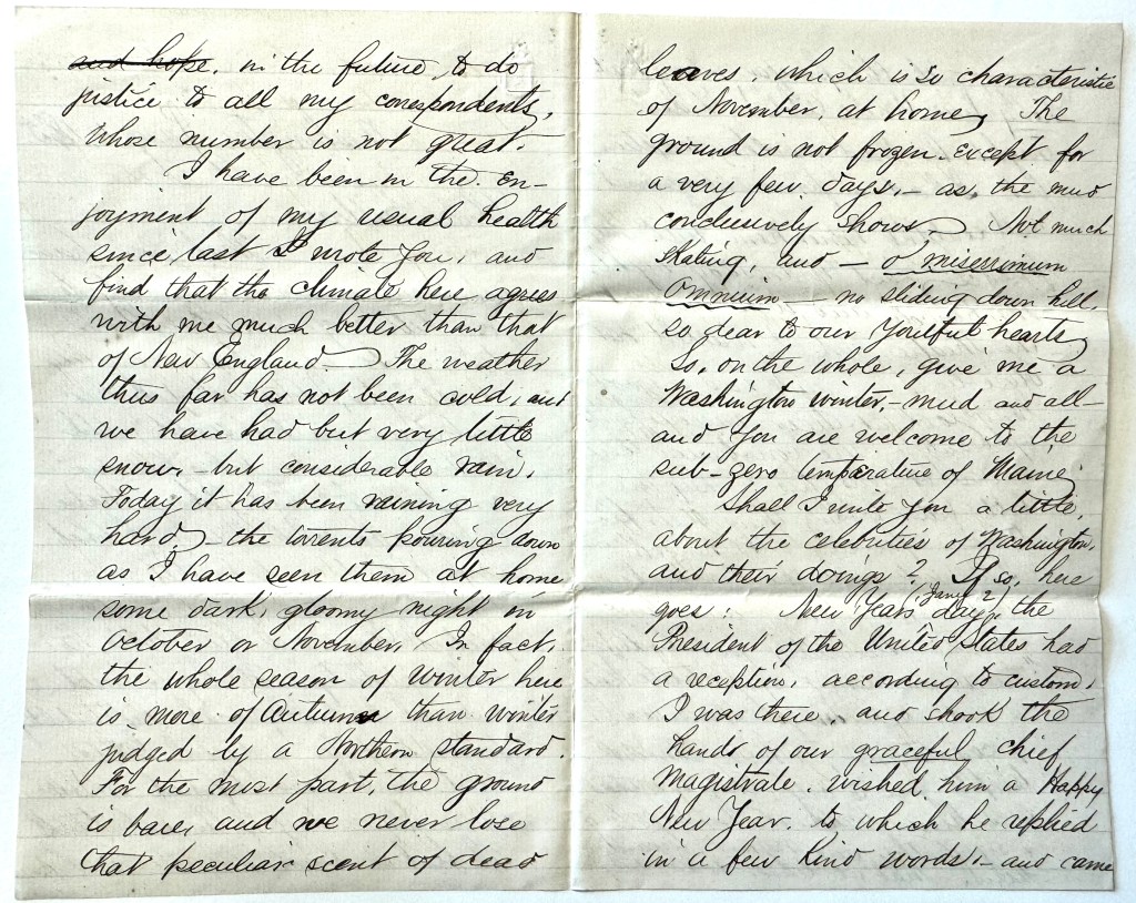 I have been in the enjoyment of my usual health since last I wrote you, and find that the climate here agrees with me much better than that of New England. The weather thus far has not been cold, and we have had but very little snow—but considerable rain. Today it has been raining very hard—the torrents pouring down as I have seen them at home some dark, gloomy night in October or November. In fact, the whole season of winter here is more of autumn than winter judged by a Northern standard. For the most part, the ground is bare, and we never lose that peculiar scent of dead leaves which is so characteristic of November at home. The ground is not frozen except for a very few days as the mud conclusively shows. Not much skating and—O miserrimum omnium—no sliding downhill, so dear to our youthful hearts. So, on the whole, give me a Washington winter—mud and all—and you are welcome to the sub-zero temperatures of Maine.