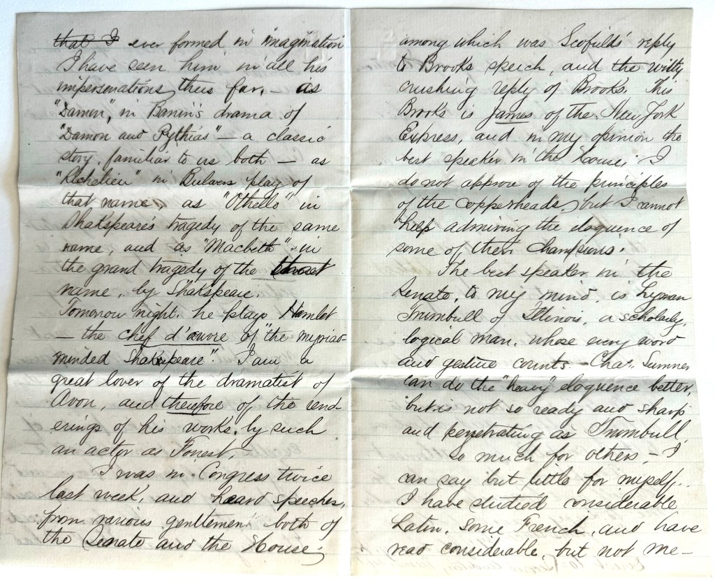 I have also seen Vice-Admiral Farragut and wife, Secretary Staton and wife, Gens. Hancock, Meigs, Custer, Casey, nearly all the Senators and Representatives in Congress, and many other eminent men. But the greatest of them all, to my mind, is Edwin Forrest, the great tragedian, who is now acting at Ford’s Theatre. There is something sublime and most wonderful in that man’s power. He hasn’t his equal on the stage in Europe or America. Of course I cannot describe his points of excellence, but in respect to physical development, power and compass of voice, and expression of countenance, he far exceeds the highest ideal that I had ever formed in imagination. I have seen him in all his impersonations thus far, as “Damon” in Banim’s drama of “Damon and Pythias”—a classic story, familiar to us both; as “Richelieu” in Bulwer’s play of that name; as “Othello” in Shakespeare’s tragedy of the same name; and as “Macbeth” in the grand tragedy of that name by Shakespeare. Tomorrow night he plays Hamlet—the chef d’amour of “the myriad minded Shakespeare.” I am a great lover of the dramatist of Avon, and therefore of the renderings of his works by such an actor as Forrest.
