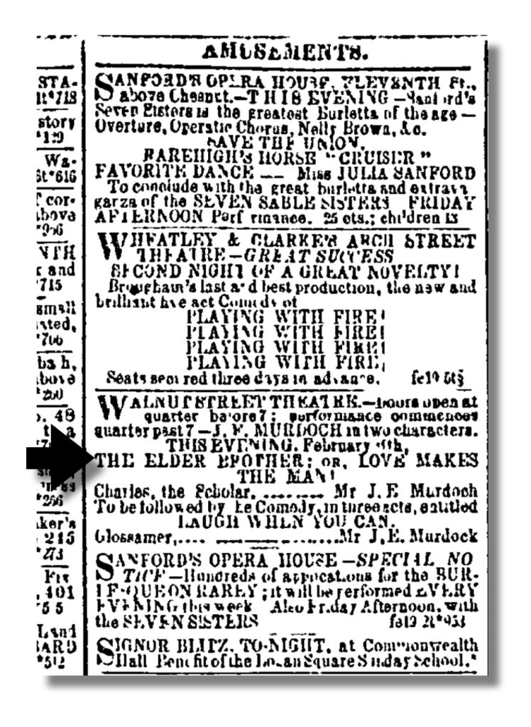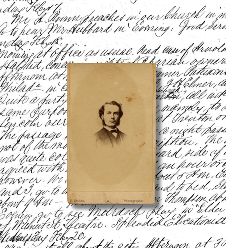 Monday, February 18—Morning at office as usual. Read case of Arnold vs. Mandy, 1 Halsted, concerning rights of Riparian owners. Afternoon at 4 pm leave in steamer Patuxent for Philadelphia in company with C. M. R., J. H. Elmer, and others. Quite a party joins us at Greenwich, all intent on same purpose with ourselves—namely, to see Mr. Lincoln, our Executive-elect, at Trenton or Philadelphia. The passage in the boat, being a night passage, was not of the most pleasant description. The weather was quite cold and the windward side of the boat agreed with the weather. I got an hour or two’s sleep, however. We arrive in Philadelphia about 5 a.m. Elmer, Riley, and I go to the Union Hotel and to bed. Sleep until about 9 a.m. In morning call on Thompson at his offfice. Evening go to see [James Edward] Murdock play in “Elder Brother” at Walnut St. Theatre. Splendid elocutionist.