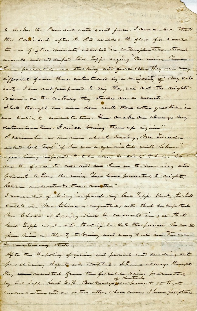 After Col. Topp finished with his views, which seemed to strike the President with great force, I remember that the President after he had walked the floor for some ten or fifteen minutes absorbed in contemplation, turned around and addressed Col. Topp, saying, “The views you have presented are striking and forcible. They are very different from those entertained by a majority of my cabinet. I am not prepared to say they are not the right views. On the contrary, they strike me as correct.