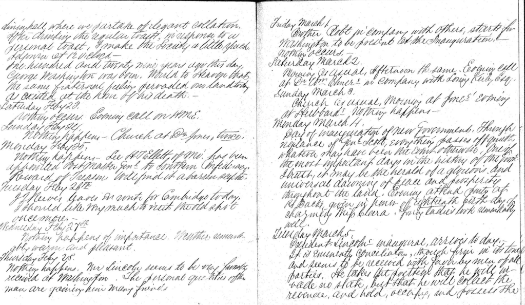 Friday, March 1—Brother Robert in company with others starts for Washington to be present at the Inauguration, Nothing occurs.