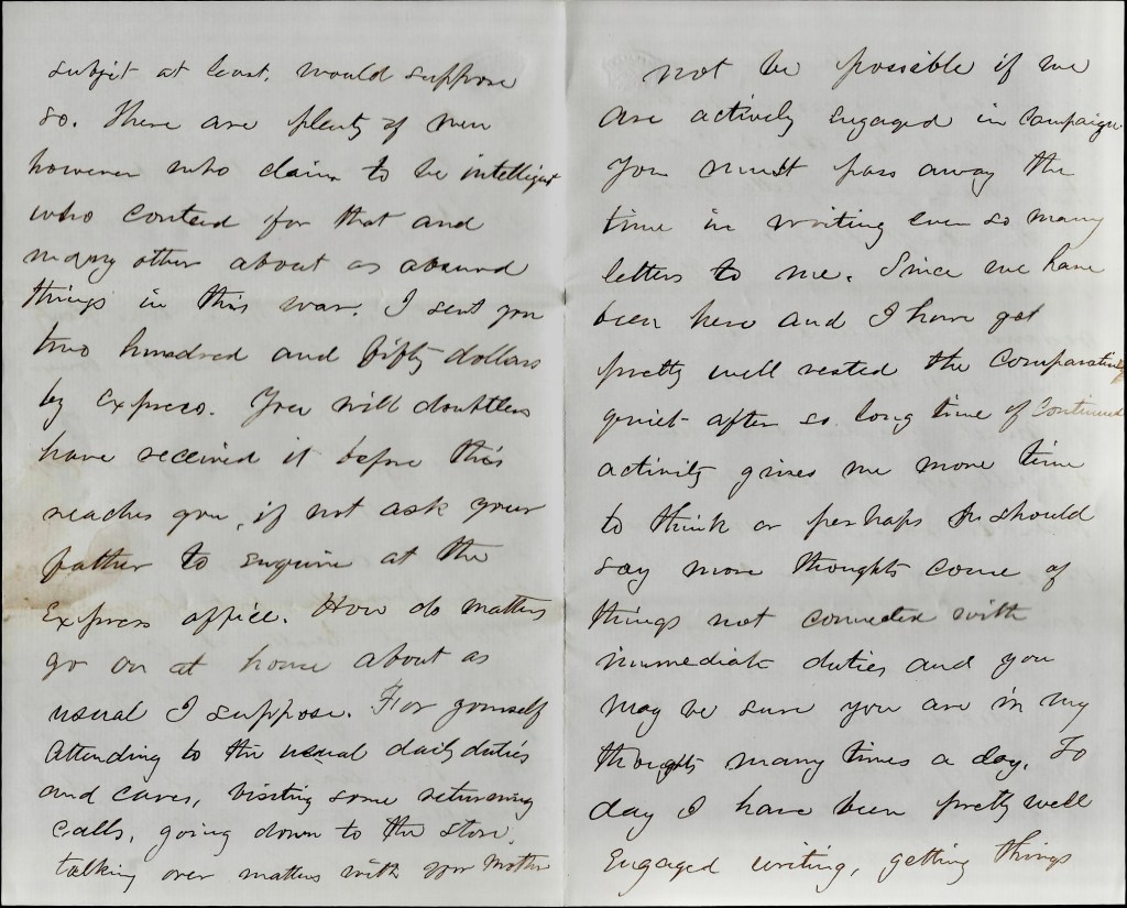 I sent you two hundred and fifty dollars by Express. You will doubtless have received it before this reaches you. If not, ask your father to enquire at the Express Office. How do matters go on at home? About as usual I suppose. For yourself attending to the usual daily duties and cares, visiting some returning calls, going down to the store, talking over matters with your mother and Hattie, talking a great deal to Patey and watching her girlish pranks, thinking a great deal about Howard, reading the papers for war news, watching for a letter from me and hoping that all this may end and you will soon be in your own house with your husband. The picture makes you a very loving wife and is somewhat flattering to myself, but it is true, is it not wifey, you little sweet. Just imagine a good kissing.