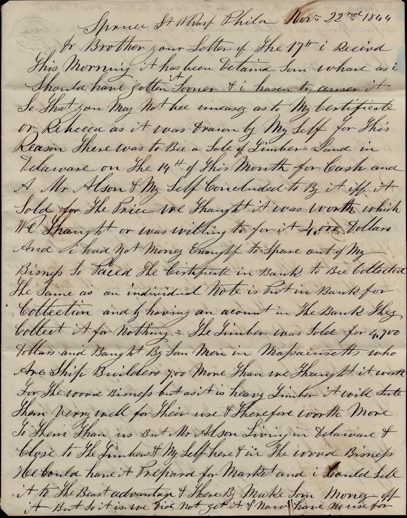 Your letter of the 17th I received this morning. It has been detained somewhere as I should have gotten it sooner & I have to answer it so that you may not be uneasy as to my Certificate or Rebecca as it was drawn by myself for this reason. There was to be a sale of timber land in Delaware on the 14th of this month for cash and a Mr. Alson & myself concluded to buy it if it sold for the price we thought it was worth which we thought, or was willing to [pay] for it 4000 dollars. And I had not money enough to spare out of my business so asked for the Certificate in Bank to be collected, the same that an individual Note is put in bank for collection, and I having an account in the bank, they collect it for nothing. The timber was sold for $4,700 dollars and bought by some men in Massachusetts who are ship builders—700 more than we thought it worth for the wood business, but as it is heavy timber, it will suit them very well for their use & therefore worth more to them than us.