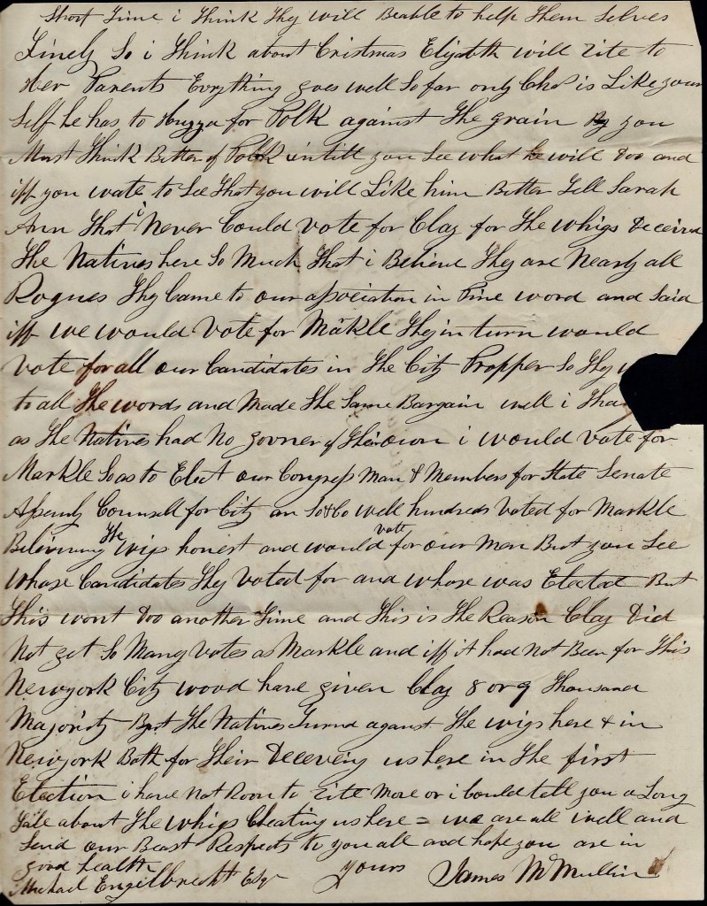 Everything goes well so far—only Charles is like yourself, he has to Huzza for Polk against the grain. You must think better of Polk until you see what he will do and if you wait to see that, you will like him better. Tell Sarah Ann that I never could vote for Clay for the Whigs deceived the Natives here so much that I believe they are nearly all rogues. They came to our association in Pine Wood and said if we would vote for Markle, they in turn would vote for all our candidates in the city proper. So they went to all the wards and made the same bargain. Well, I thought as the Natives had no Governor of their own, I would vote for Markle so as to elect our Congressman & members for State Senate Assembly Council for City and &c. Well hundreds voted for Markle believing the Whigs honest and would vote for our man but you see whose candidates they voted for and whose was elected. But this won’t do another time and this is the reason Clay did not get so many votes as Markle and if I had not been for this New York City, would have given Clay 8 or 9 thousand majority. But the Natives turned against the Whigs here and in New York both for their deceiving us here in the first election.