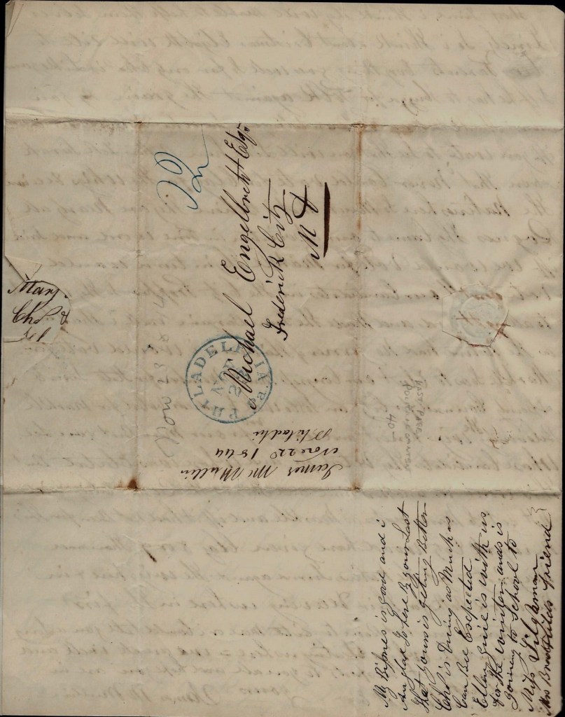 The following 1844 letter was written by James McMullin (1810-Aft1853)—a wood corder and local politician of Philadelphia, Pennsylvania. He wrote the letter to his sister Rebecca (McMullin) Engelbrecht (1802-1847) and her husband Michael Engelbrecht (1792-1886) in Frederick, Maryland. Rebecca and Michael were married in Philadelphia in August 1838.