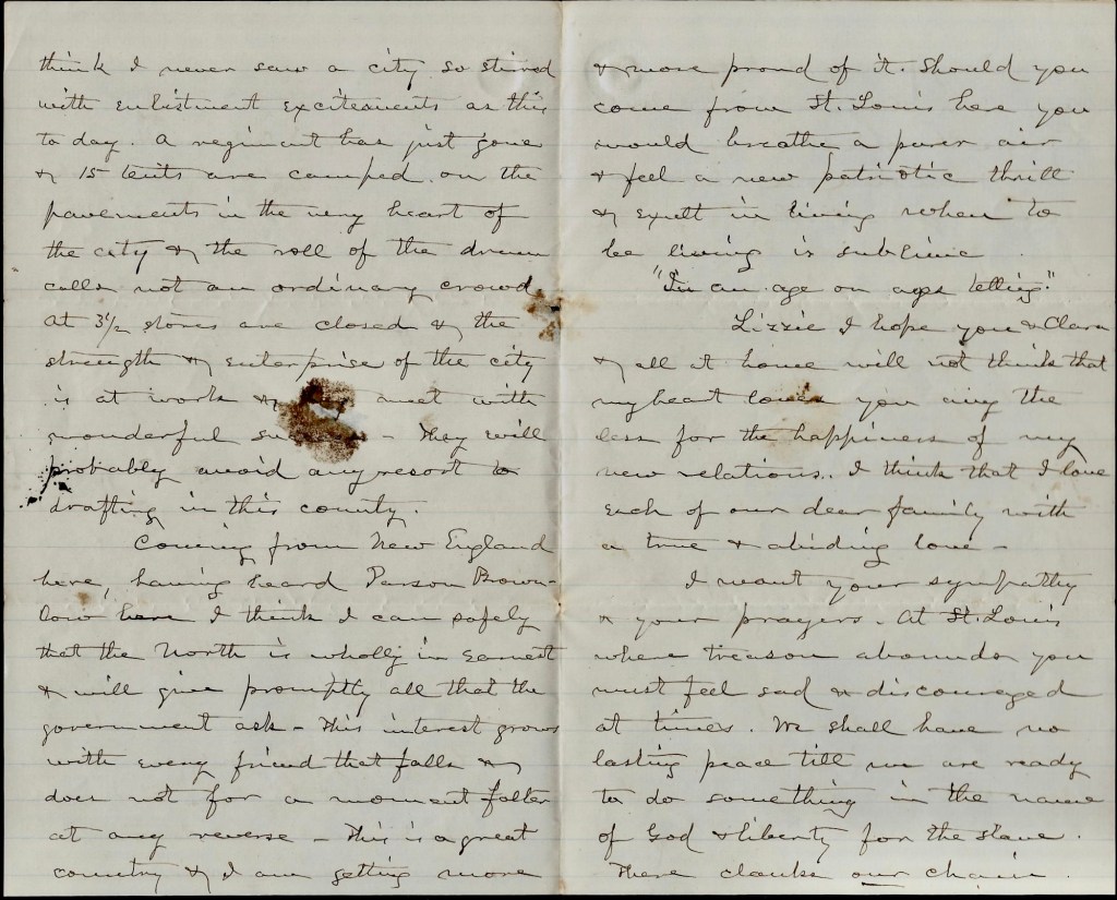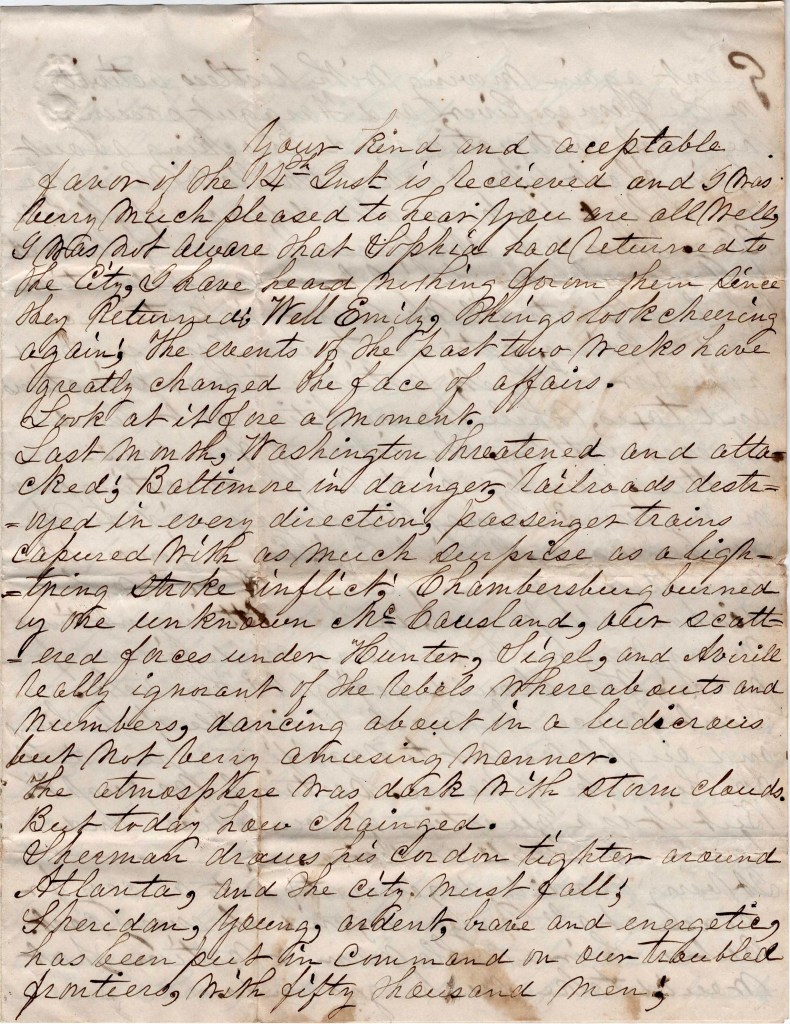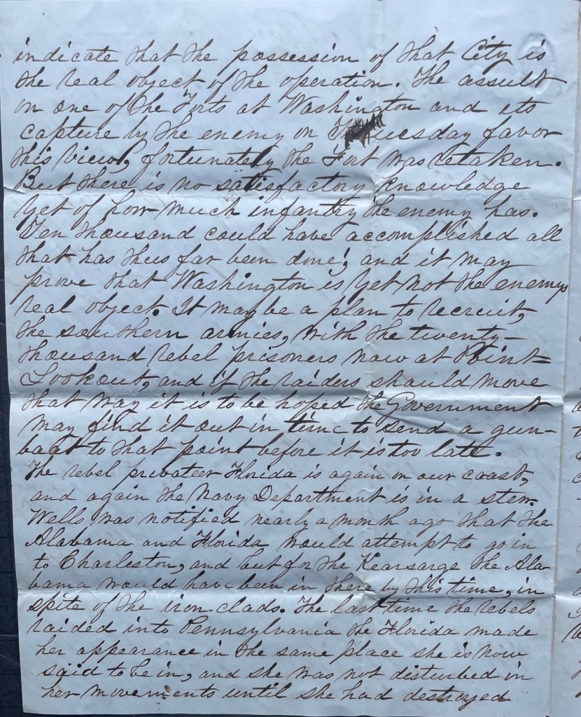 Our corps is still encamped on the heights a mile and a half from the river in full view of the steeples and a few houses in Atlanta which as the bird flies is 2 miles, but by the railroad, 8 miles. I think by the 15th of August we will be in town, and by the 1st of September, Grant will have Richmond. This is my private opinion, publicly expressed. From accounts, the Johnnies are stirring them up tolerably lively in Maryland. It will not amount to much in my opinion. It is a raid to obtain supplies more than with the expectation of diverting Grant from his great purpose of capturing the Rebel Capitol. The prospects of the Rebels are now desperate and they know that unless they can gain some important advantage, and that soon, they are ruined forever. They are satisfied and so am I that this is the last year of the war and if they cannot defeat our armies this summer and fall, they never can do it. Hence their reckless dashes and efforts to destroy the yanks. I am satisfied the result will be alright and six months from this time will see the end.