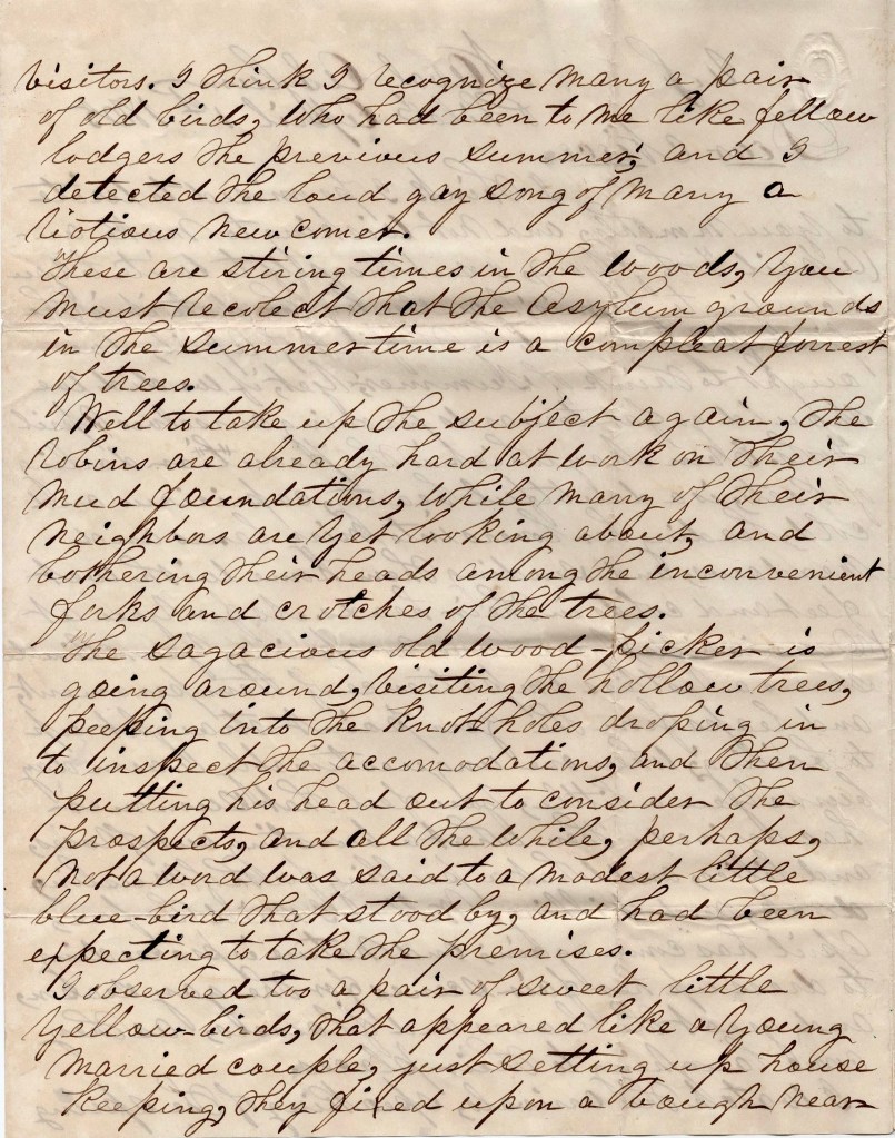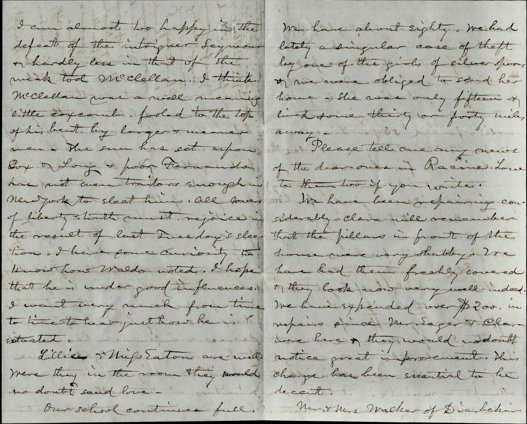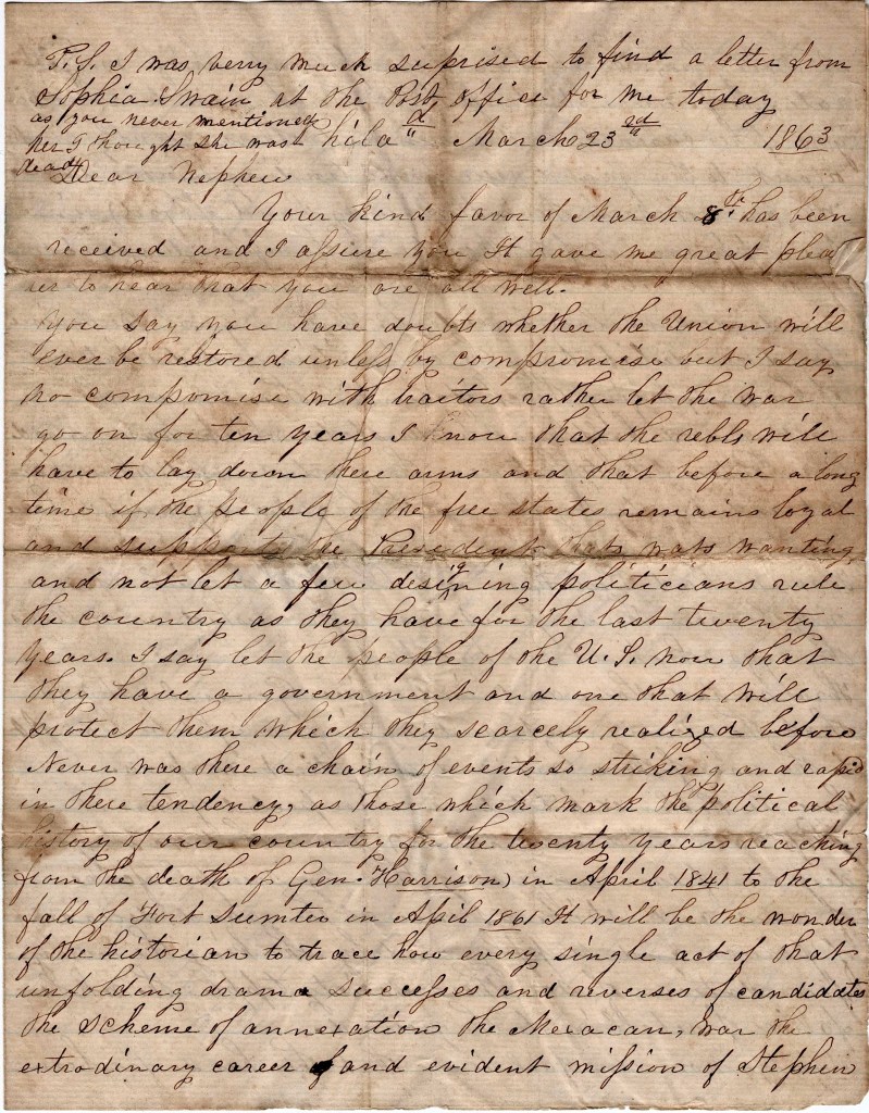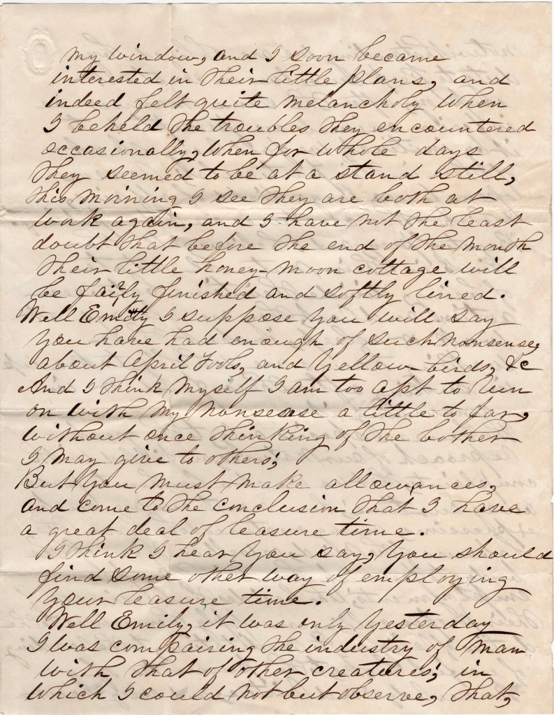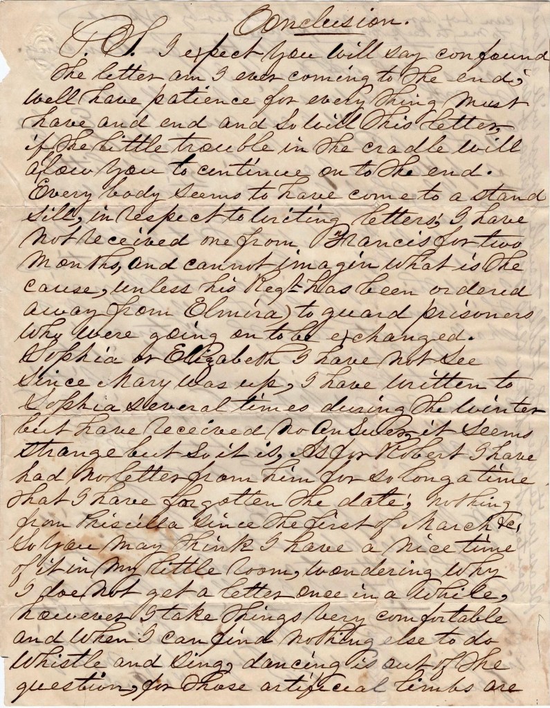 P. S. I received a letter from Malinda the other day. I had no paper, and had to write an answer on a page she had not filled. I trust she will not think hard. It was the best I could do, and also one from father. I had to scribble an answer on a blank side of a leaf.