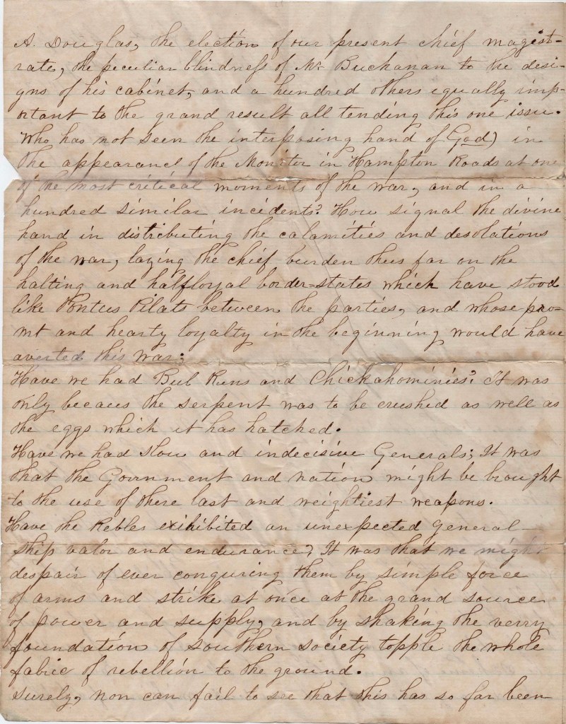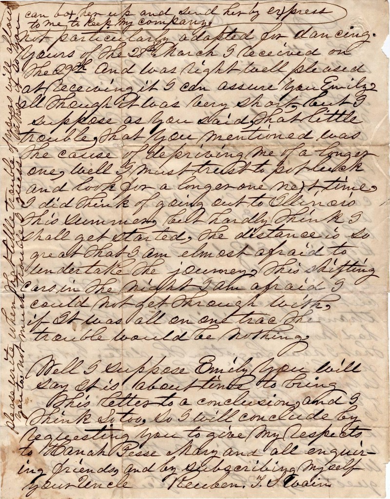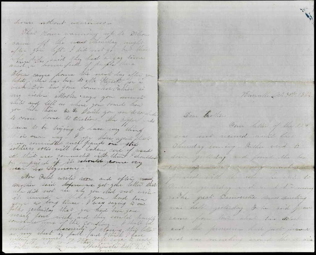 In answer to your kind favor of the 20th, I pen you a few lines tonight. I had begun to think that all my friends in Pike county except Rachel had forsaken me. But night before last, I was undeceived. The letters just poured in. I sat for about two hours and read letters and felt as clever as ever Aunt Sallie did in a Methodist lovefeast. You tried to excuse yourself by saying the reason you didn’t write was that there was nothing to write about. I accept no such excuses for there was something to write about. You were all alive and well, were you not? You could have wrote and told me that certainly. And I assure you, nothing could be written that would interest me so much as that. Just let me know that are all are well at home and I can get along very well. Of course I like to hear all of the news, but I want you to make this the last time that, like Macabre, you wait for something to turn up before you write. 1