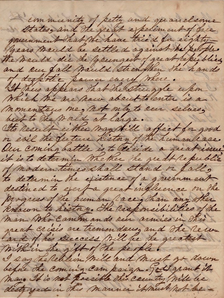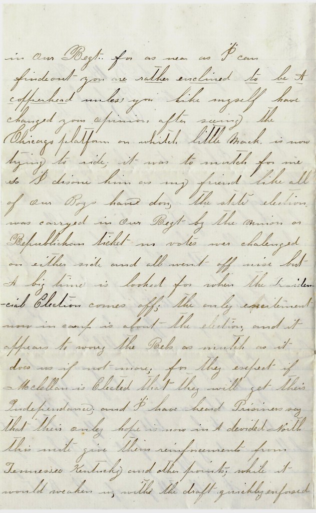 It seems that Saint Val [Clement Vallandigham] did not create as much excitement on his advent into Ohio as might have been expected. The fact is the old sinner, like his chum John Morgan, is just about played out. So much so in fact that neither of them when stirred up will make a stink. For the life of me, I can’t conceive why the lovers of Val should get sick over anything that McClellan could say because there is as little similarity between them as there is between day and night. McClellan is just as upright, honest, and patriotic as they are sneaking, traitorous, and contemptible. Since it is out of the question for the general to be their man for President, yet one consolation remains to them. There is yet balm in Gilead. Frémont still lives and as the abolition butternuts have already taken him to their immaculate bosoms and roll him as a sweet morsel under their tongues, take my word for it, that the Val-ites will do the same, and the postponement of the Chicago [Democratic] Convention is more than presumptive evidence of this fact and that long before the Presidential election, they will be cheek by jowl with the sneaking abolitionists that they have heretofore cursed so much as the cause of the war and all that.