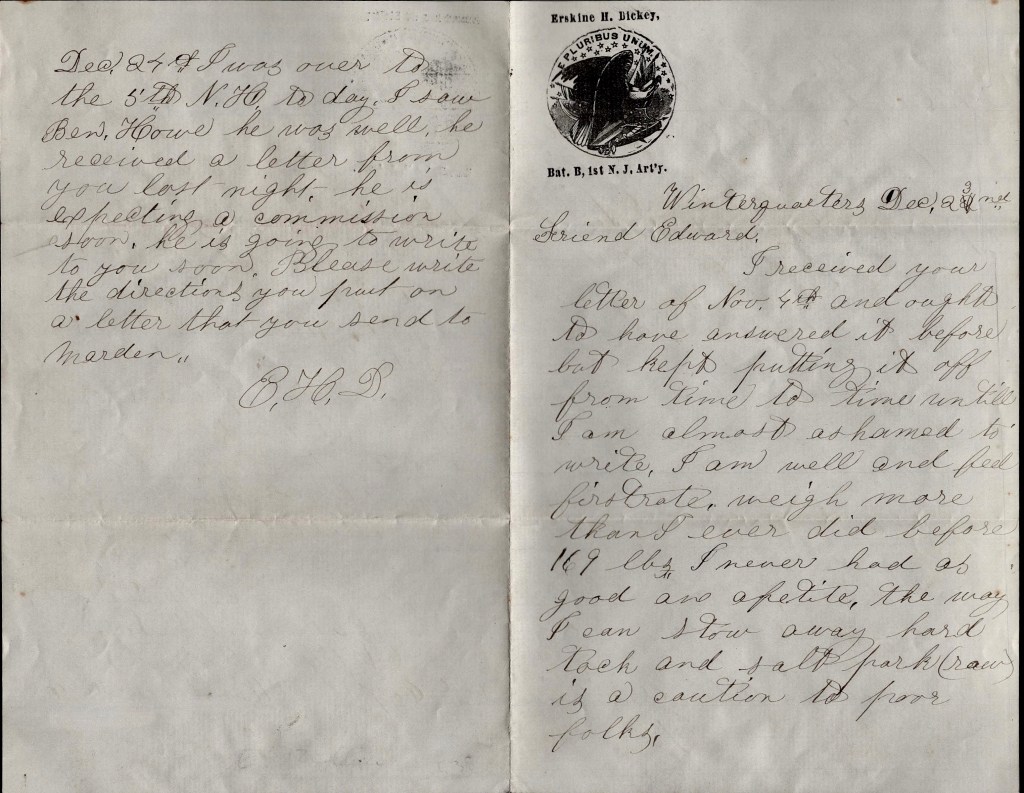 There will be an effort made in a few days to induce the 33rd [Ohio] to go in as veterans but don’t think it will be successful. Ben Lewis made application for a furlough the other day. His papers came back this morning vetoed. The Waverly boys are all well. In fact, nearly everybody here is well. This has been a warm, sunny day but looks now as though the rain would pour before morning.