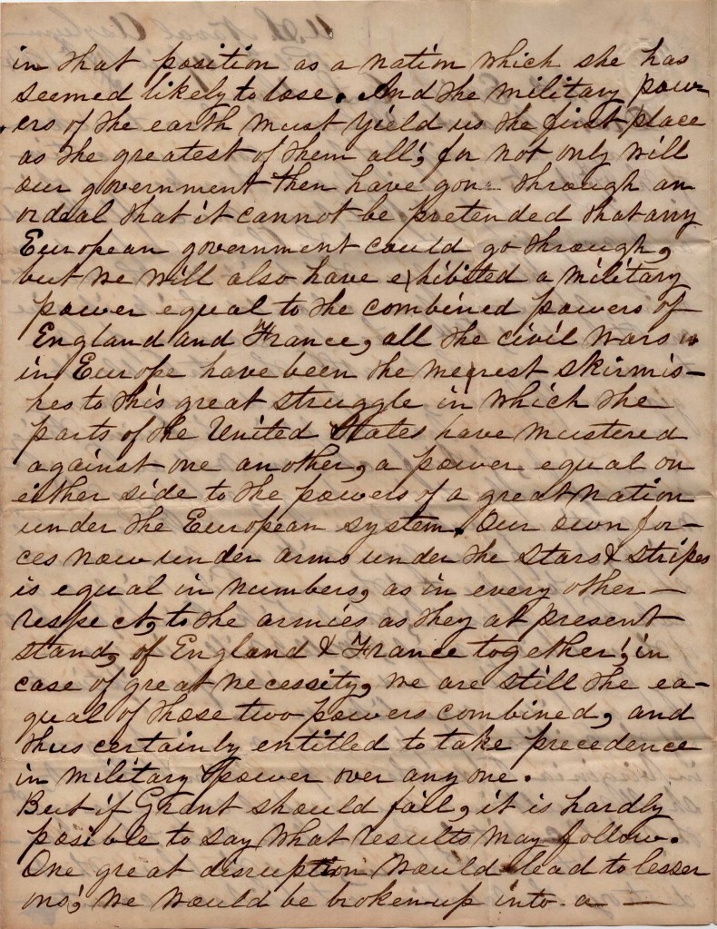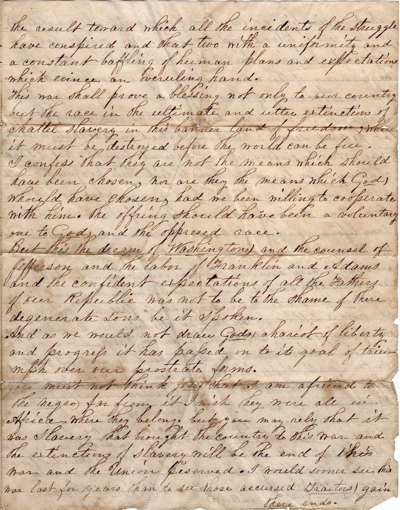 A word or two from the other side and we are done. The Union Convention at Baltimore seen fit in their great wisdom—or more likely the want of it—-to nominate old Abe for another term. He is a bitter pill, you may well believe, for me to take. But as a rational being, of two evils I am bound to take the least and vote for him in preference to Frémont. The nomination for Vice President suits me better. Andy Johnson, I believe, to be one of the best men in the country. He is honest, capable, and better than all, attends to his own business which is more than can be said of Uncle Abe. This will do on politics for a while I think.
