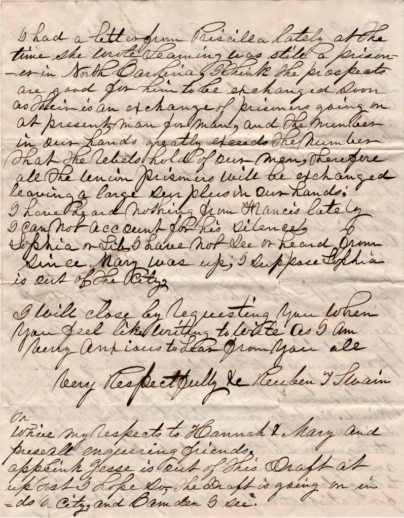 I pen you a few lines this afternoon. My health is very good at present and I hope and trust this may find yourself and little ones well. I am glad that notwithstanding the prevalence of much sickness around you that it has not yet entered our own doors and I trust a kind Providence that it may not. In what respect you favor the eel [?] you speak of is more than I can say, but as it regards the scolding you got from me, it certainly was not as tormenting in its effects as taking the hide off. It was not so intended. At least its effects were very gratifying—it brought you and Rachel both out. I give her a little [scolding] also and at last I heard another tune that pleased me better than Morgan. As to an apology, you need never to have mentioned it because I have got to be one of the best natured individuals in the world.