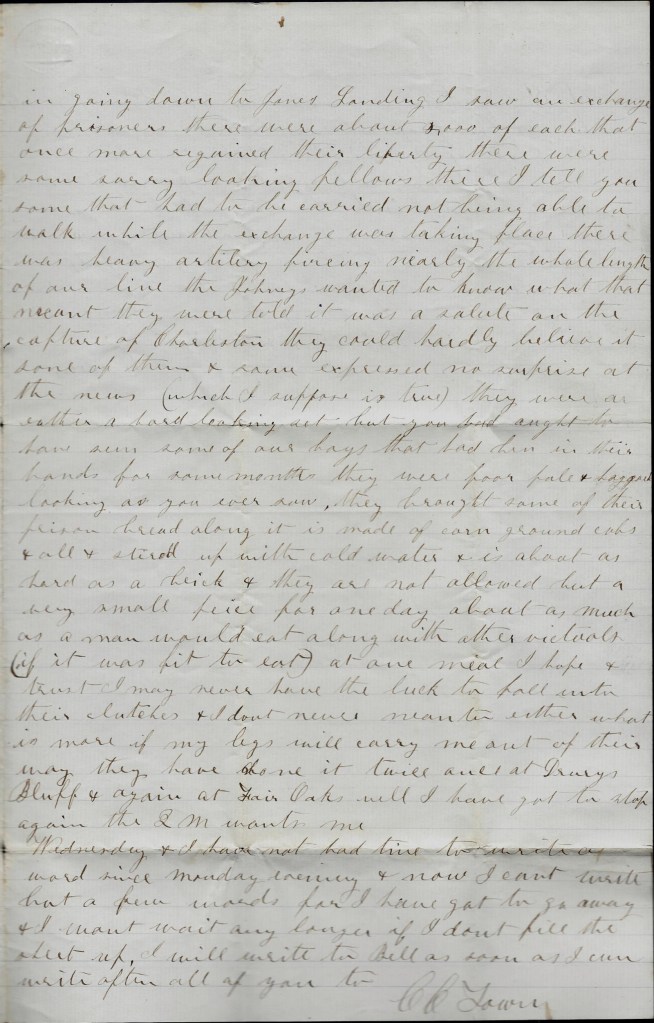 In going down to Jones Landing I saw an exchange of prisoners. There were about 2,000 of each that once more regained their liberty. There were some sorry-looking fellows there, I tell you—-some that had to be carried, not being able to walk. While the exchange was taking place, there was heavy artillery firing nearly the whole length of our line. The Johnnies wanted to know what that meant. They were told it was a salute on the capture of Charleston. They could hardly believe it some of them, and some expressed no surprise at the news (which I suppose is true). They were a rather hard-looking set but you had ought to have seen some of our boys that has been in their hands for some months. They were poor, pale, and haggard-looking as you ever saw. They brought some of their prison bread along. It is made of corn ground, cobs and all, and stirred up with cold water and is about as hard as a brick and they are not allowed but a very small piece for one day—about as much as a man would eat along with other victuals (if it was fit to eat) at one meal.