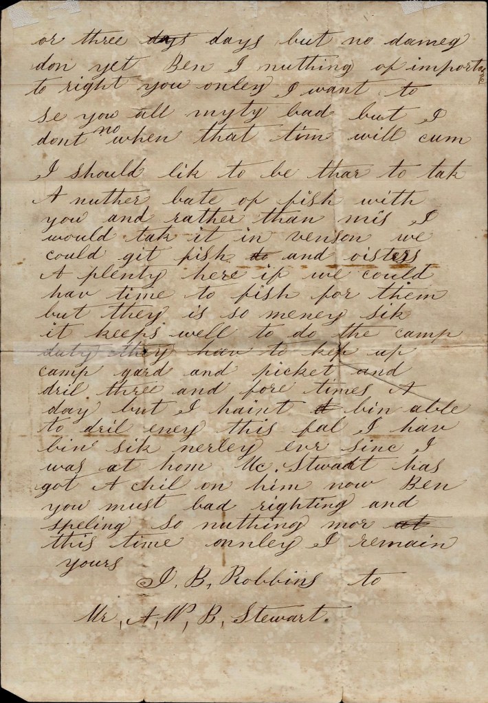[Charles J.] McD. Stewart has got a chill on him now. Ben, you must [excuse my] bad writing and spelling. So nothing more this time only I remain yours, — J. B. Robbins