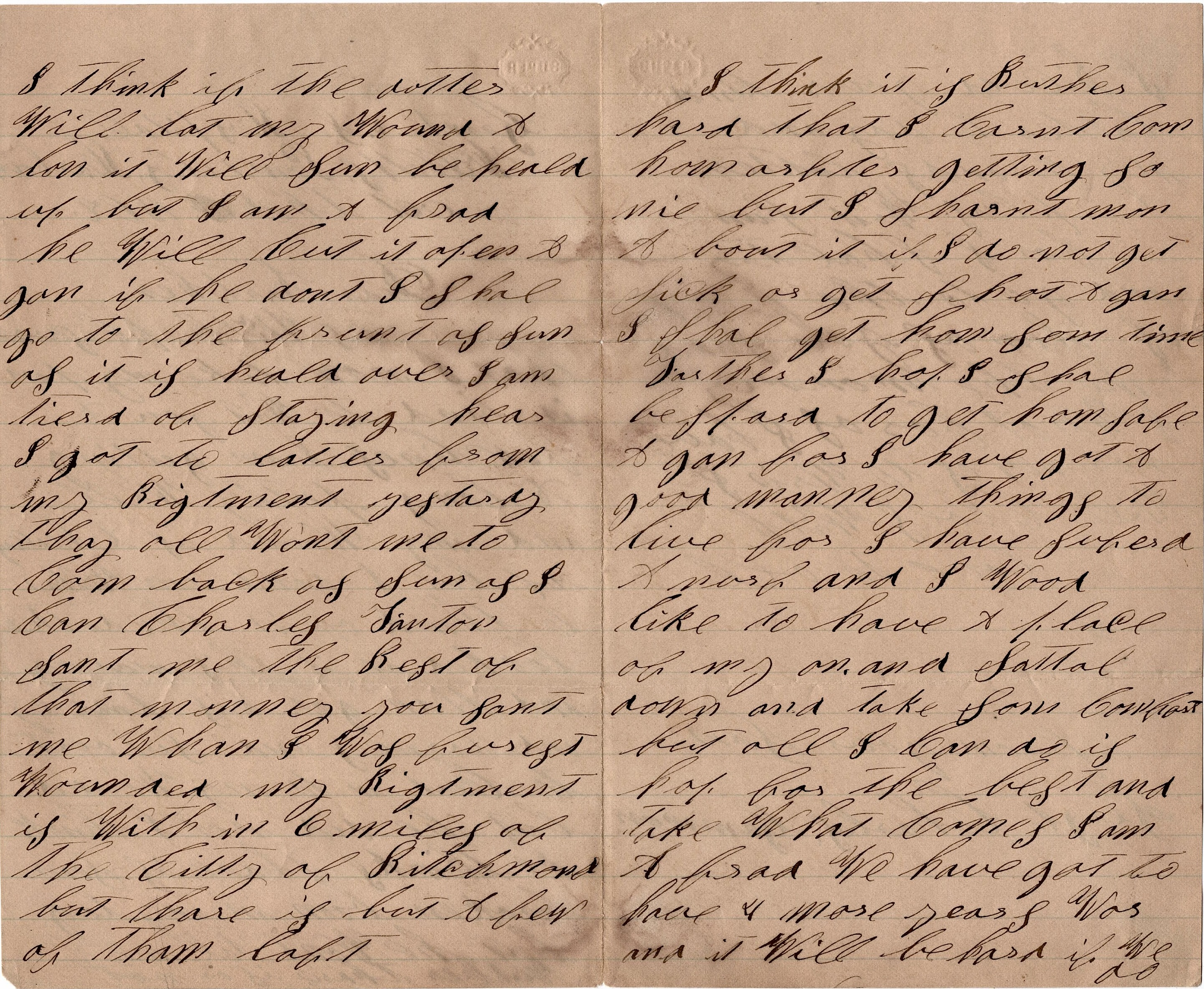 I got two letters from my regiment yesterday. They all want me to come back as soon as I can. Charles Tauton sent me the rest of that money you sent me when I was first wounded. My regiment is within 6 miles of the City of Richmond but there is but a few of them left. I think it is rather hard that I can’t come home after getting shot but I shan’t moan about it if I do not get sick or get shot again. I shall get home sometime.