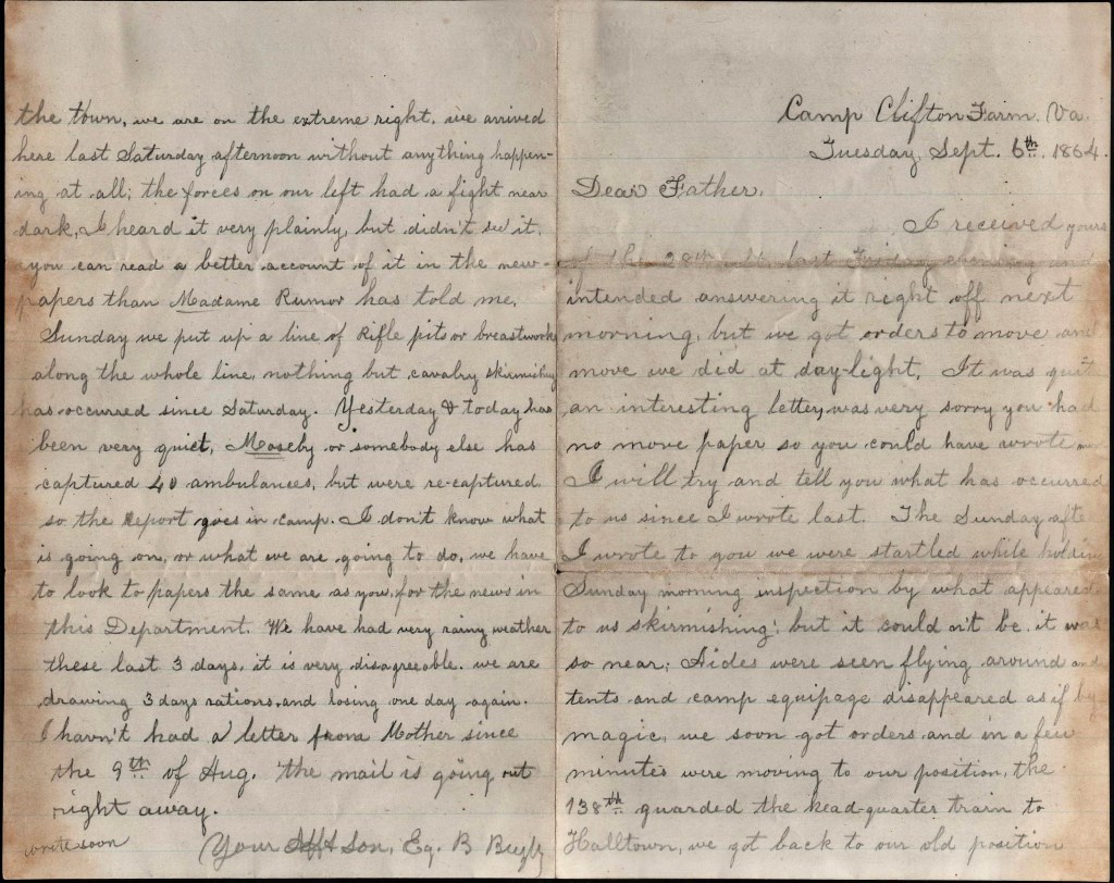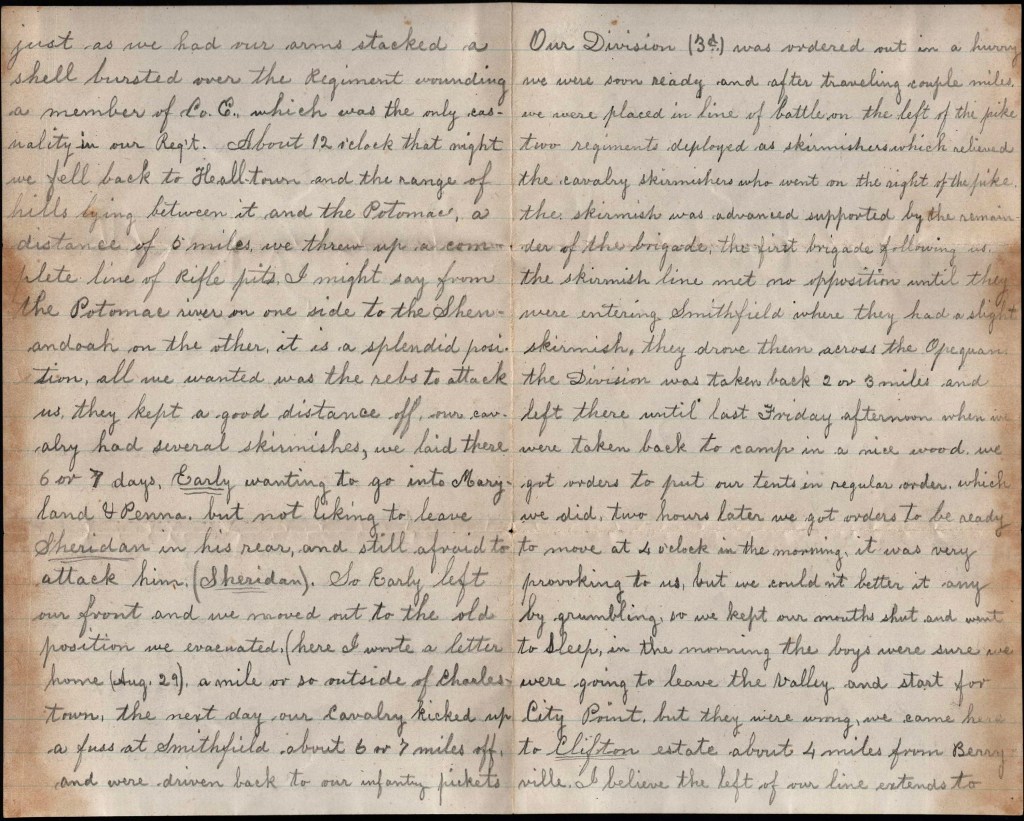 Most all of the foot soldiers lost all their knapsacks and clothing. The rebels followed quite close and gave us a few shells which fell to the right and left of us but hurt no one. I had quite a pile of clothing &c. for them and I suppose some are getting the benefit of it among the rebels. We left Martinsburg last Monday, marched 3 days, and are now expecting to cross the Shenandoah to Front Royal at any time. We don’t know where we are to go—only know where we are at present.