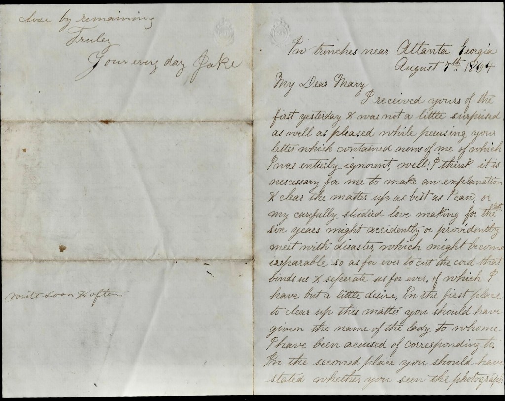 We are all in hopes to be in Atlanta soon where I expect this campaign will terminate. I have some affairs to attend to at the North and think I shall go to Chicago and to make Uncle Joe a visit as soon as we wind things up in this section. We hear bad news from Grant. It beats the devil that those Potomac boys can’t get along. They have only one decent Corps to fight and that is Hancock’s, which is composed entirely of western men. We hear this morning that the Confederates are in Pennsylvania and Maryland 30,000 strong. Well, if they stay at home portion of community can’t clear them out of that, I hope they will stay for a while. I wonder where the “Union League” is? I am in hopes this “creole war” [cruel war] will soon be over. When it is, I shall either get married and settle right square down for the rest of my days or else I shall go to California. If I had been smart, I would have been married and have had a home before this.