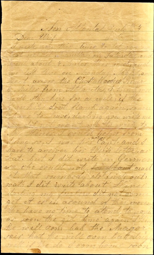 I am writing letters this afternoon and will do the best I can for you. I wrote Mother a letter day before yesterday I think. It is almost impossible to get a chance to write a line here at present. Until a day or two since, we have been continually upon the move and have seen some sport, I can tell you. At present we are lying very near (within half a mile) of the Chattahoochee River. The Confederate skirmishers are upon one side and the Yanks on the other. From the Signal Station on a high hill half a mile to the rear of our headquarters, we can plainly see the City of Atlanta. Mighty nice town it is too. Old Sherman has his eye on it.