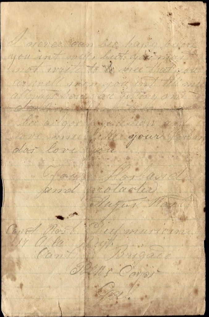 Tell Rhoda I will write her tomorrow and answer the questions she was so particular about. At present I am not doing much of anything. I am waiting for an officer of the Engineers Corps to return from the North with whom Col. Rogers is anxious I should remain. I can’t tell for a few days what my future will be. Should I got into the Engineers Corps, I hope to do first rate. I will keep you advised of my proceedings.