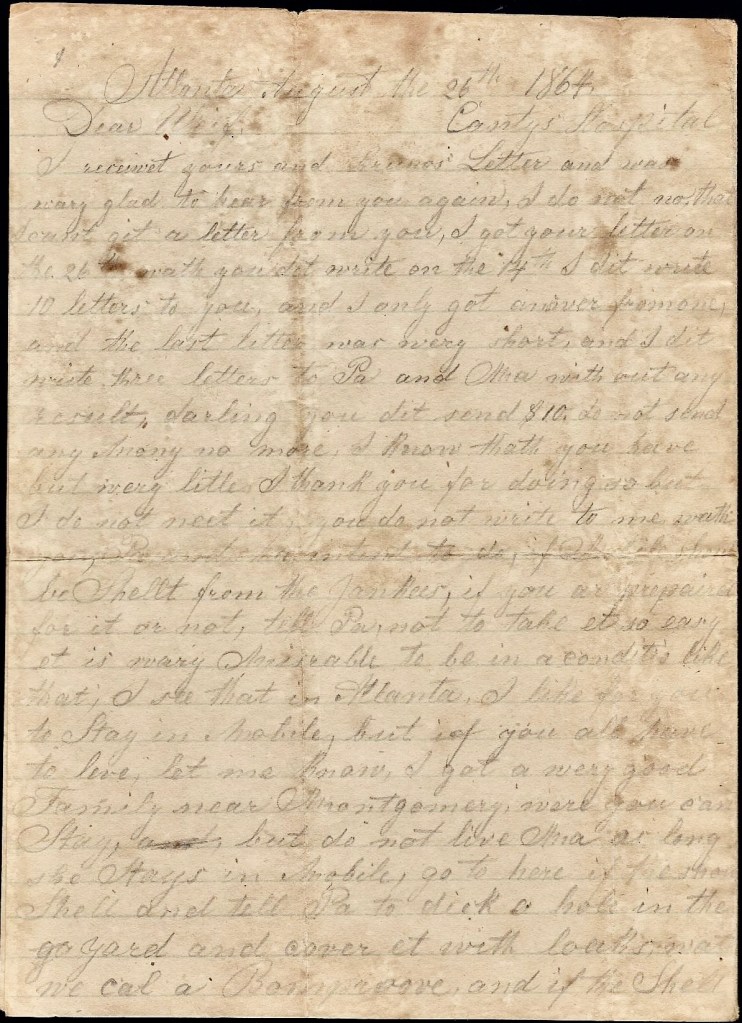 I should have sent some money as you suggested but when I left Chicago, I had to use all I could raise to liquidate some debts I had contracted in fitting up an office &c. I left the town without owing a cent if I wasn’t much ahead and I suppose the time will come someday when I shall be even with this world all around. It is just utter foolishness in you to talk of my being sick &c. What is I should be? You could do nothing. Mother must not worry herself about me. If it were not for her, I would take some bigger chances than I am now taking. For my own part, I would not give a snap whether I live through the war or not. It is for her sake alone that I strive to keep from harm. The South agrees with me first rate. I would much rather live in Georgia than any other state I ever saw. The weather is warm here—decidedly warm—but then it’s even. It don’t run hot one day and cold the next.