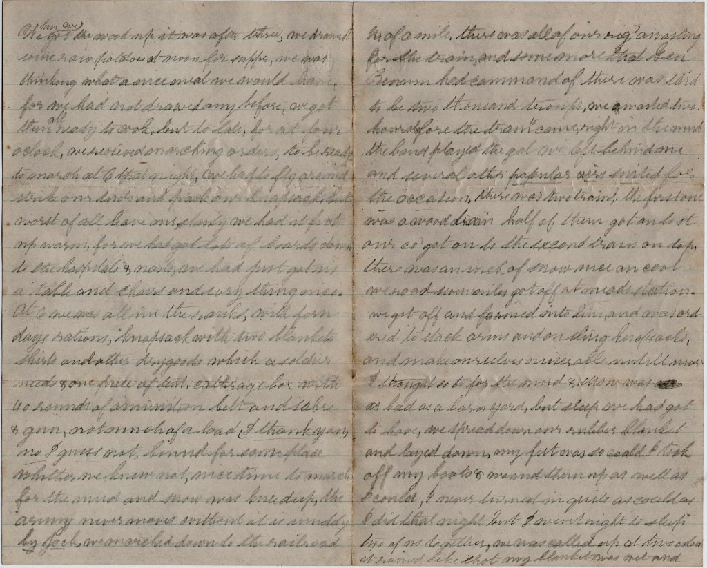 We marched down to the railroad one quarter of a mile. There was all of our regiment awaiting for the train and some more that Gen. [Henry Washington] Benham had command of. There was said to be two thousand troops. We waited two hours before the train to come right in the mud. The band played, “The Gal we left behind me” and several other popular airs suited for the occasion. There was two trains, The first one was a wood train. Half of them got onto it. Our company got on to the second train on top. There was an inch of snow—nice and cool. We rode seven miles, got off at Meade Station. We got off and formed into line and was ordered to stack arms and unsling knapsacks and make ourselves miserable until night. I thought so too for the mud & snow was as bad as a barn yard, but sleep we had got to have. We spread down our rubber blanket and laid down. My feet was so cold, I took off my boots & warmed them up as well as I could. I never turned in quite as cold as I did that night but I went right to sleep., two of us together.
