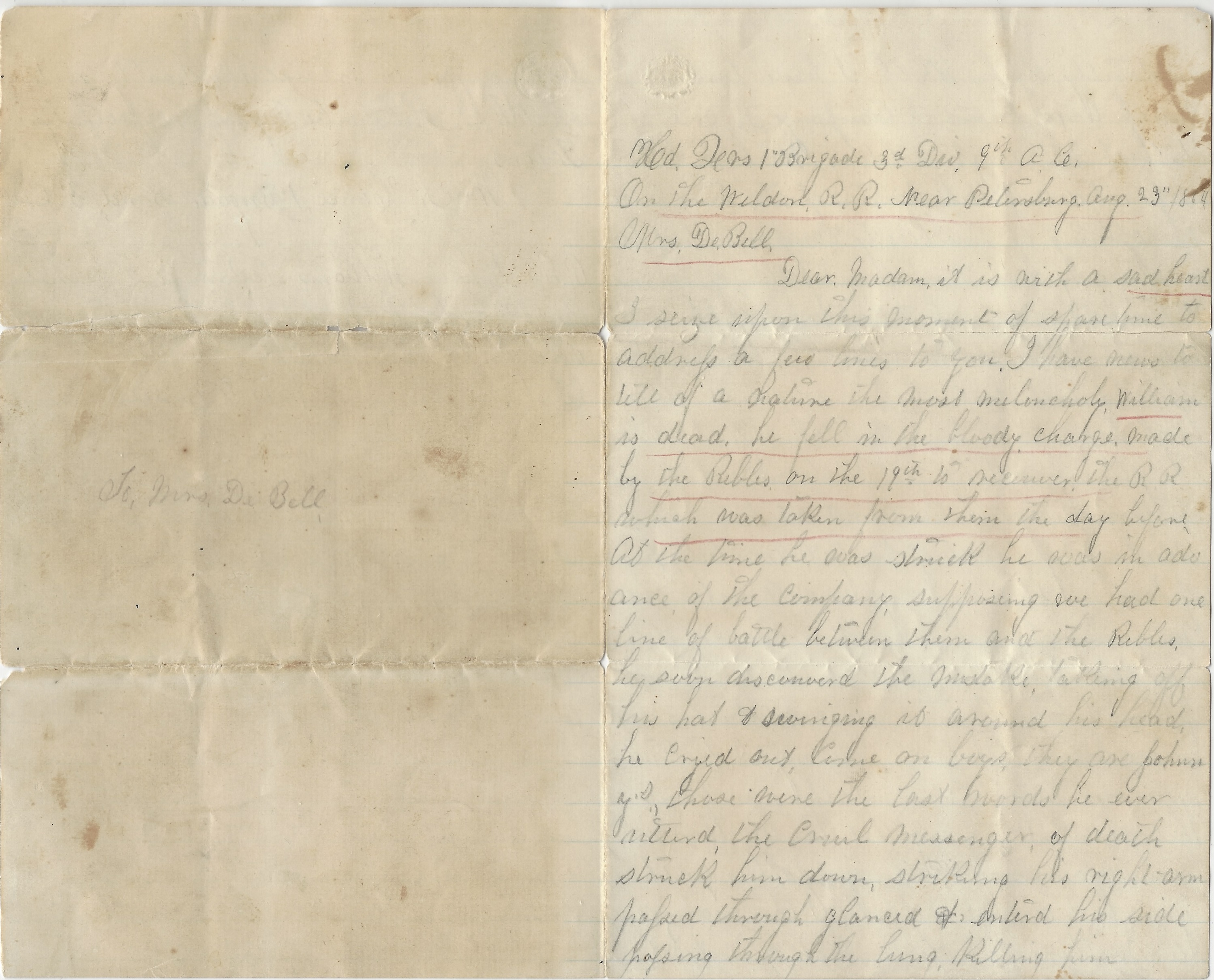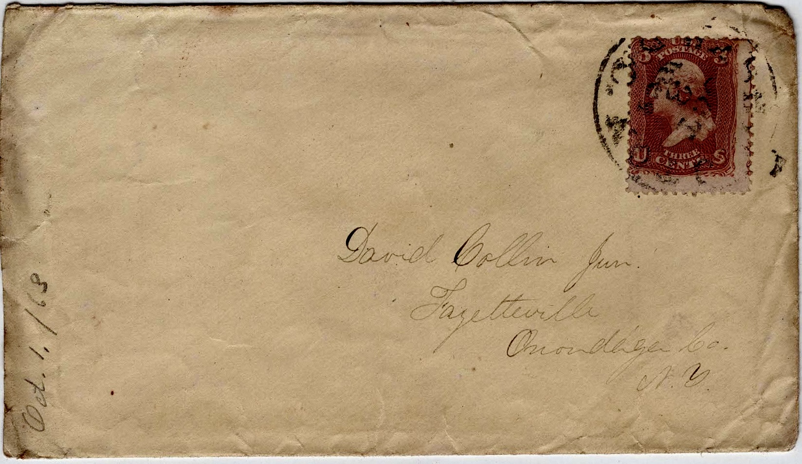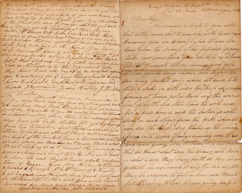 John began his military service in August 1862 when he was recruited into Co. G, 22nd New York Infantry. When that regiment mustered out in June 1863, he was transferred to Co. C of New York’s 93rd Regiment to complete his three year enlistment. He was wounded in the opening action in the Wilderness but recovered to join his regiment during the siege of Petersburg. He was killed in action on 27 October 1864 near Hatcher’s Run on the Boydton Plank Road near Petersburg, just 5 days after writing this letter to his wife and son. Muster rolls inform us that he was shot through the bowels and lived about 45 minutes before he died. It is presumed he was buried on the battlefield near where he fell.