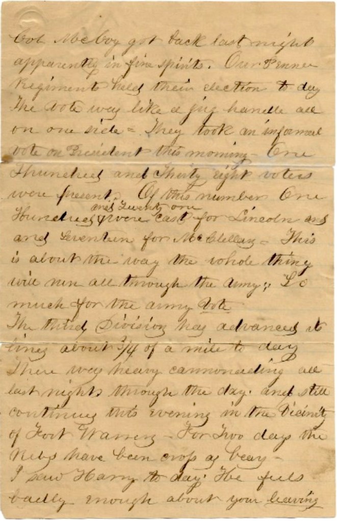 “Our Pennsylvania regiments held their election today. The vote was like a jug handle—all on one side… So much for the army vote.”