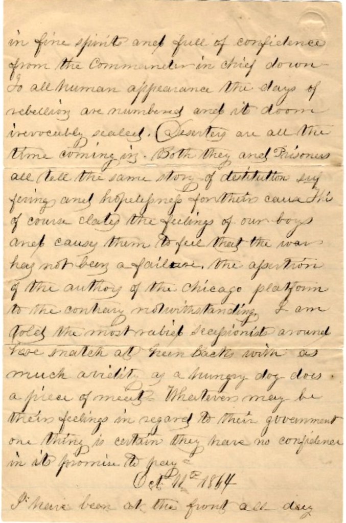 Deserters are all the time coming in. Both they and prisoners tell the same story of destitution, suffering and hopefulness for their cause. This of course elates the feelings of our boys and causes them to feel that the war has not been a failure. The assertion of the authors of the [Democratic Party’s] Chicago Platform to the contrary notwithstanding. I am told the most rabid secessionists around here snatch at Green Backs with as much avidity as a hungry dog does a piece of meat. Whatever may be their feelings in regard to their government, one thing is certain—they have no confidence in its promise to pay.