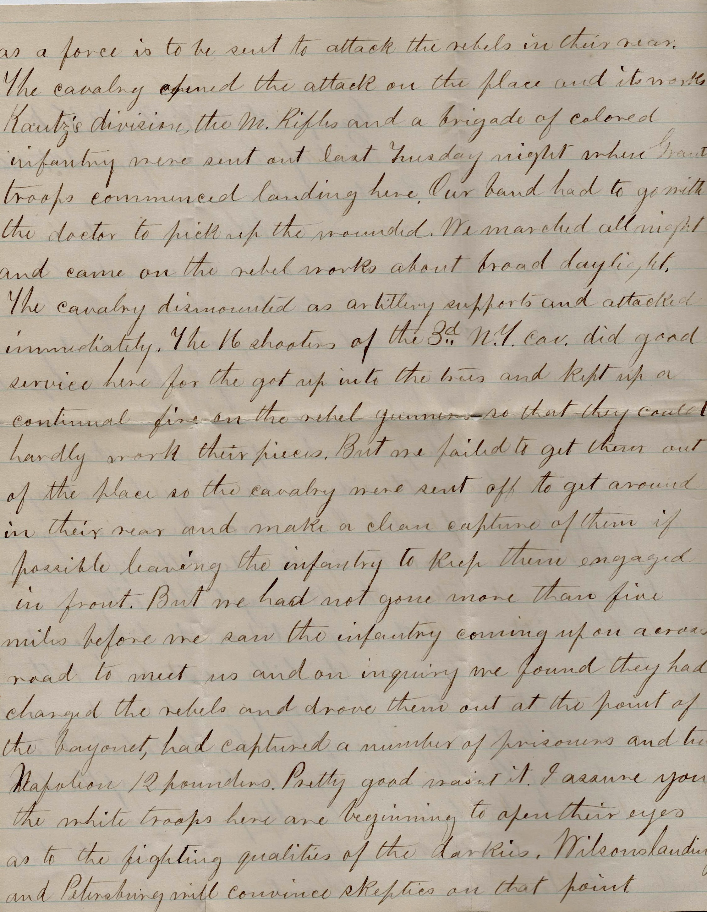 The cavalry opened the attack on the place and its works. Kautz’s division, the Mounted Rifles, and a brigade of colored infantry were sent out last Tuesday night where Grant’s troops commenced landing here. Our band had to go with the doctor to pick up the wounded. We marched all night and came on the rebel works about broad daylight. The cavalry dismounted as artillery supports and attacked immediately. The 16 shooters of the 3rd New York Cavalry did good service here for they got up into the trees and kept up a continual fire on the rebel gunners so that they could hardly work their pieces. But we failed to get them out of the place so the cavalry were sent off to get around in their rear and make a clean capture of them if possible leaving the infantry to keep them engaged in front.