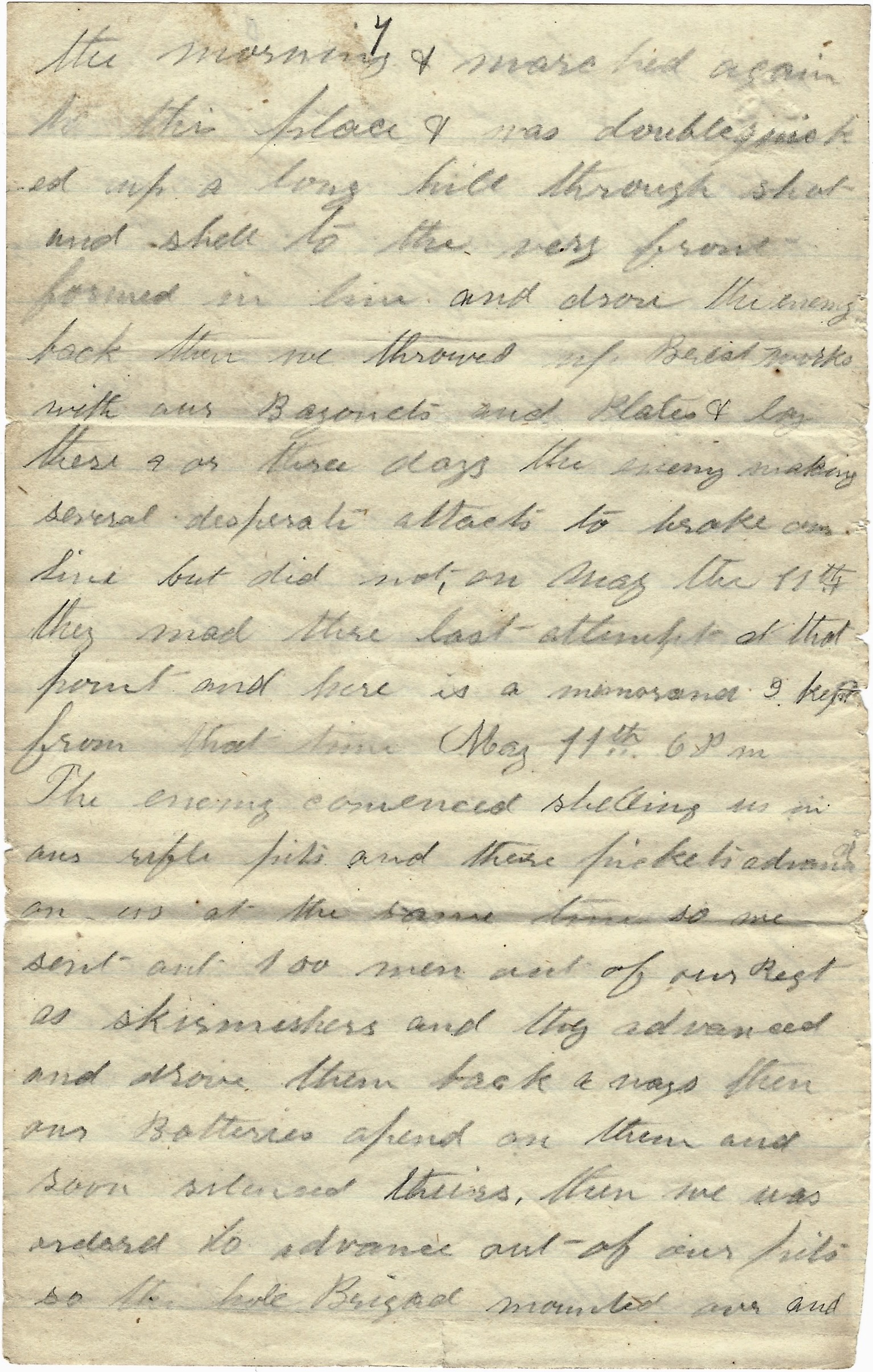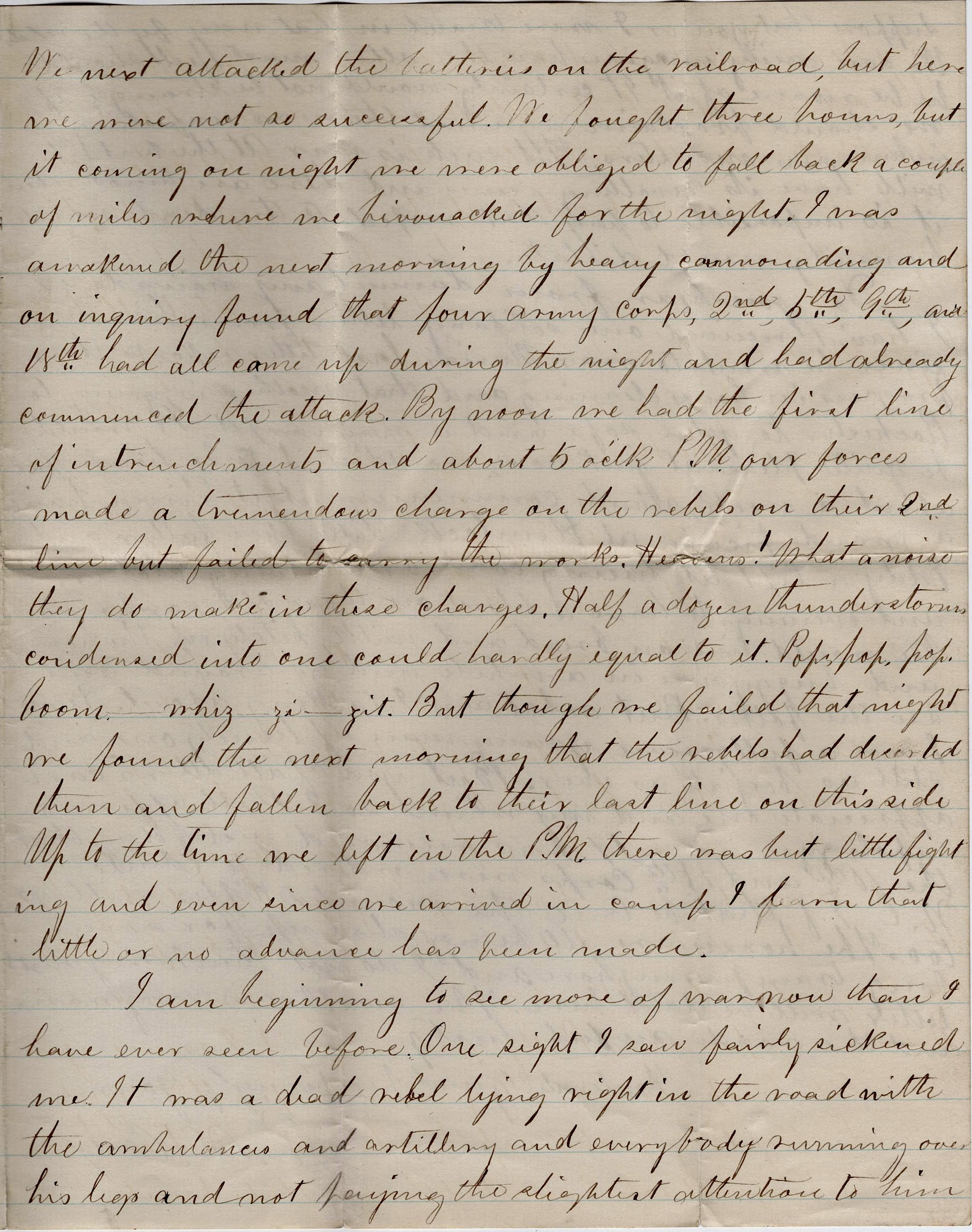 We next attacked the batteries on the railroad but here we were not so successful. We fought three hours but it coming on night, we were obliged to fall back a couple of miles where we bivouacked for the night. I was awakened the next morning by heavy cannonading and on inquiry, found that four Army Corps—2nd, 5th, 9th, and 18th—had all come up during the night and had already commenced the attack. By noon we had the first line of entrenchments and about 5 o’clock p.m. our forces made a tremendous charge on the rebels on their 2nd line but failed to carry the works. Heavens! What a noise they do make in these charges. Half a dozen thunderstorms condensed into one could hardly equal to it. Pop, pop, pop, boom—whiz—zi—zit. But though we failed that night, we found the next morning that the rebels had deserted them and fallen back to their last line on this side. Up to the time we left in the p.m., there was but little fighting and even since we arrived in camp, I learn that little or no advance has been made.