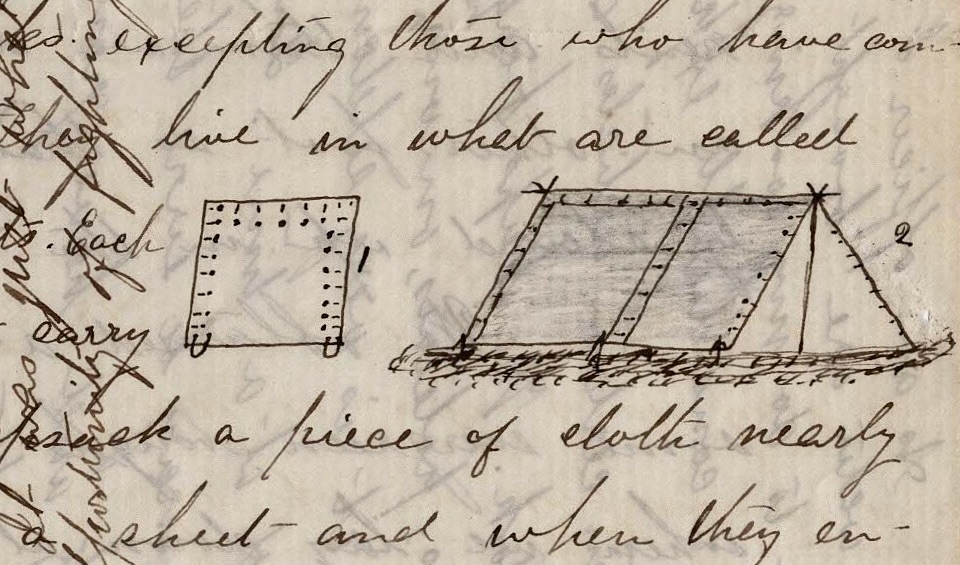 All day yesterday and today it has rained. Last night was very bad. Our tents consist of two pieces of light canvas buttoned together. These are thrown over a pole and fastened to the ground by stakes. In marching, these tents are taken apart and each man carries half a tent. These are the famous shelter tents. The pieces are about five feet square. Some of them linen—others of cotton. The canvas is about the heft and thickness of two thicknesses of heavy sheeting.