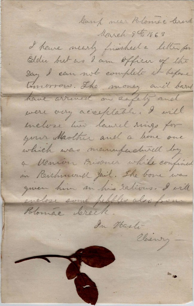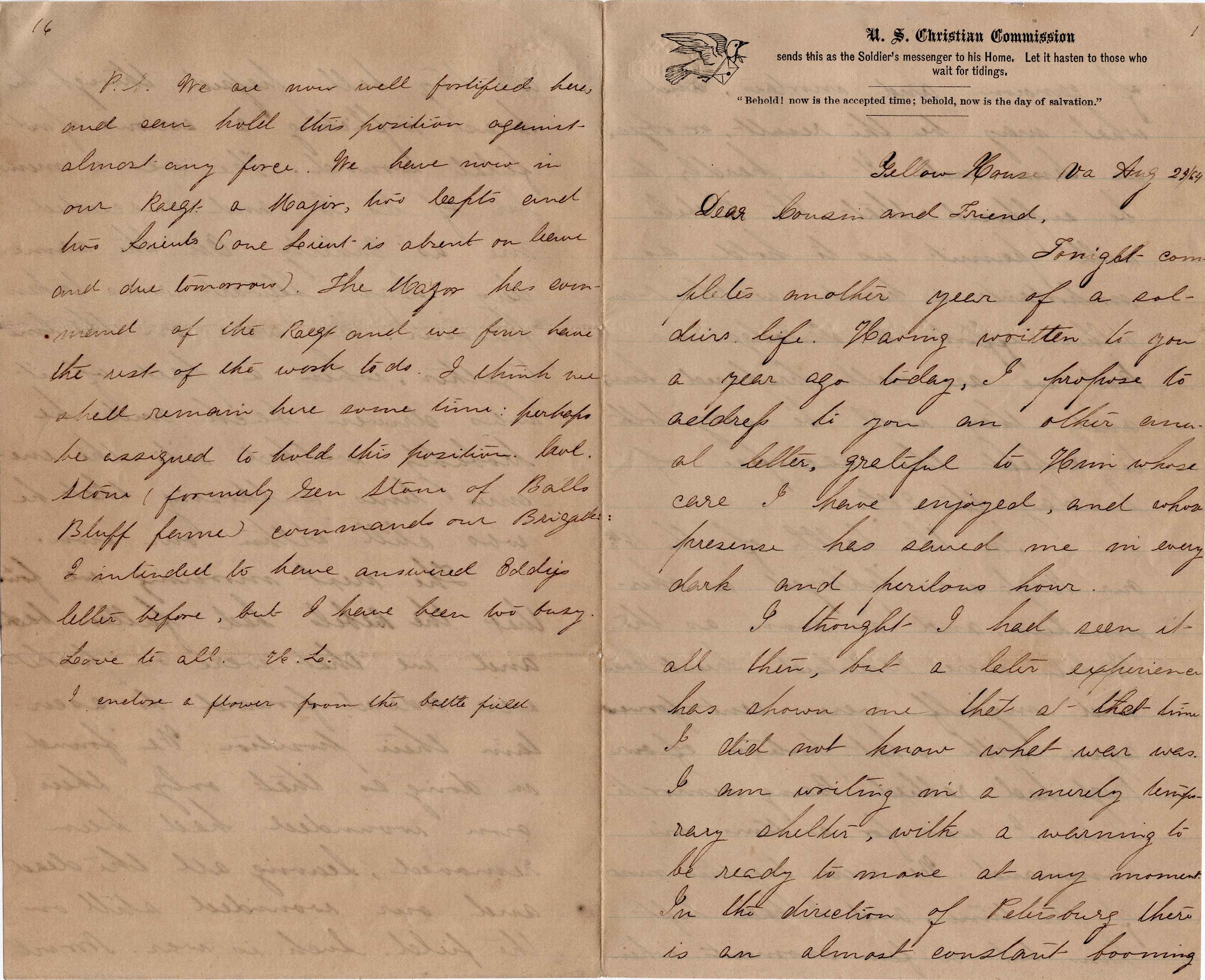 P. S. We are now well fortified here and can hold this position against almost any force. We have now in our regiment a Major, two Captains and two Lieutenants (one Lieutenant is absent on leave and due tomorrow). The Major has command of the regiment and we four have the rest of the wash to do. I think we shall remain here some time; perhaps be assigned to hold this position. Col. Stone (formerly Gen. Stone of Balls Bluff fame) commands our Brigade… I enclose a flower from the battle field. — H. L.
