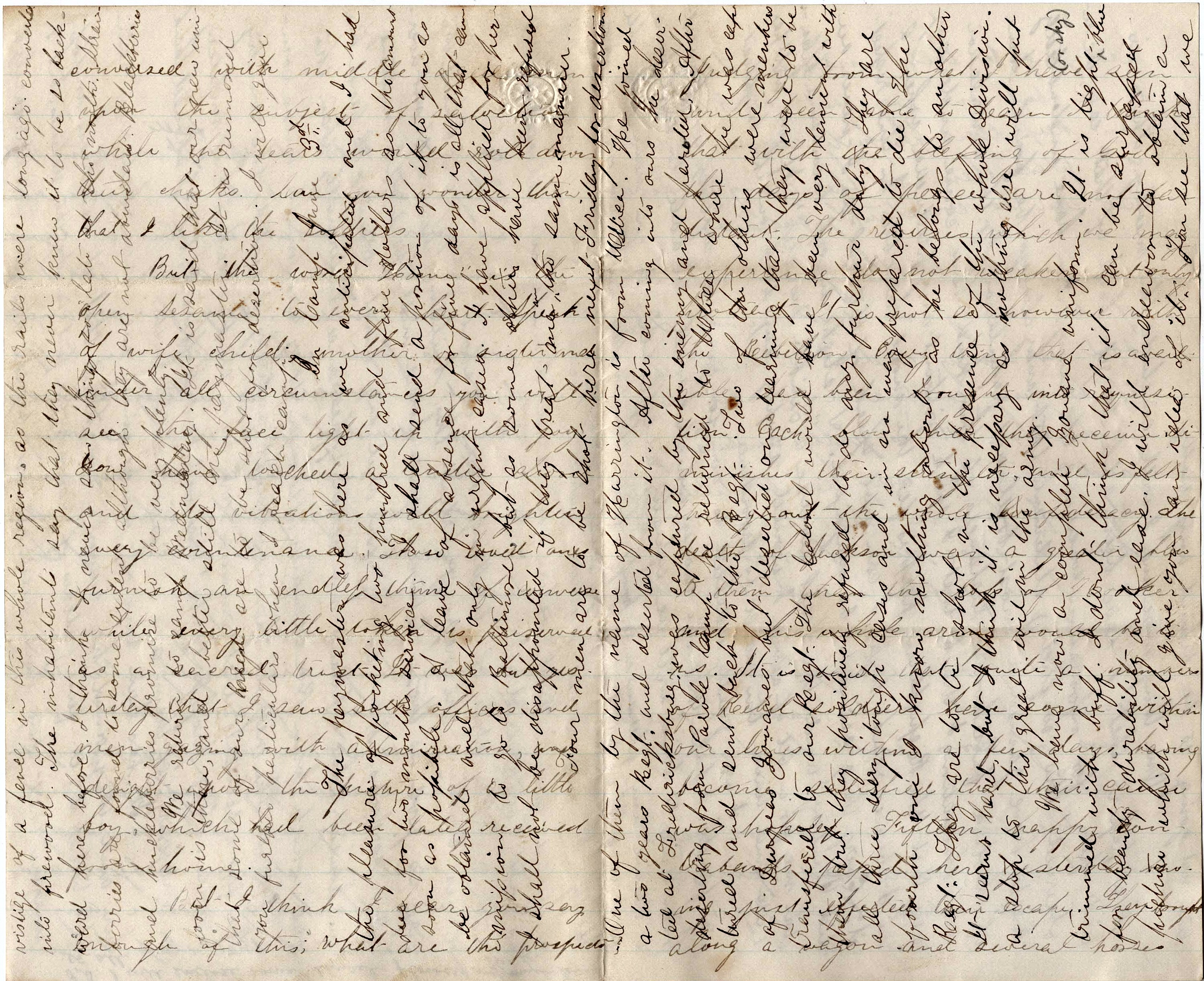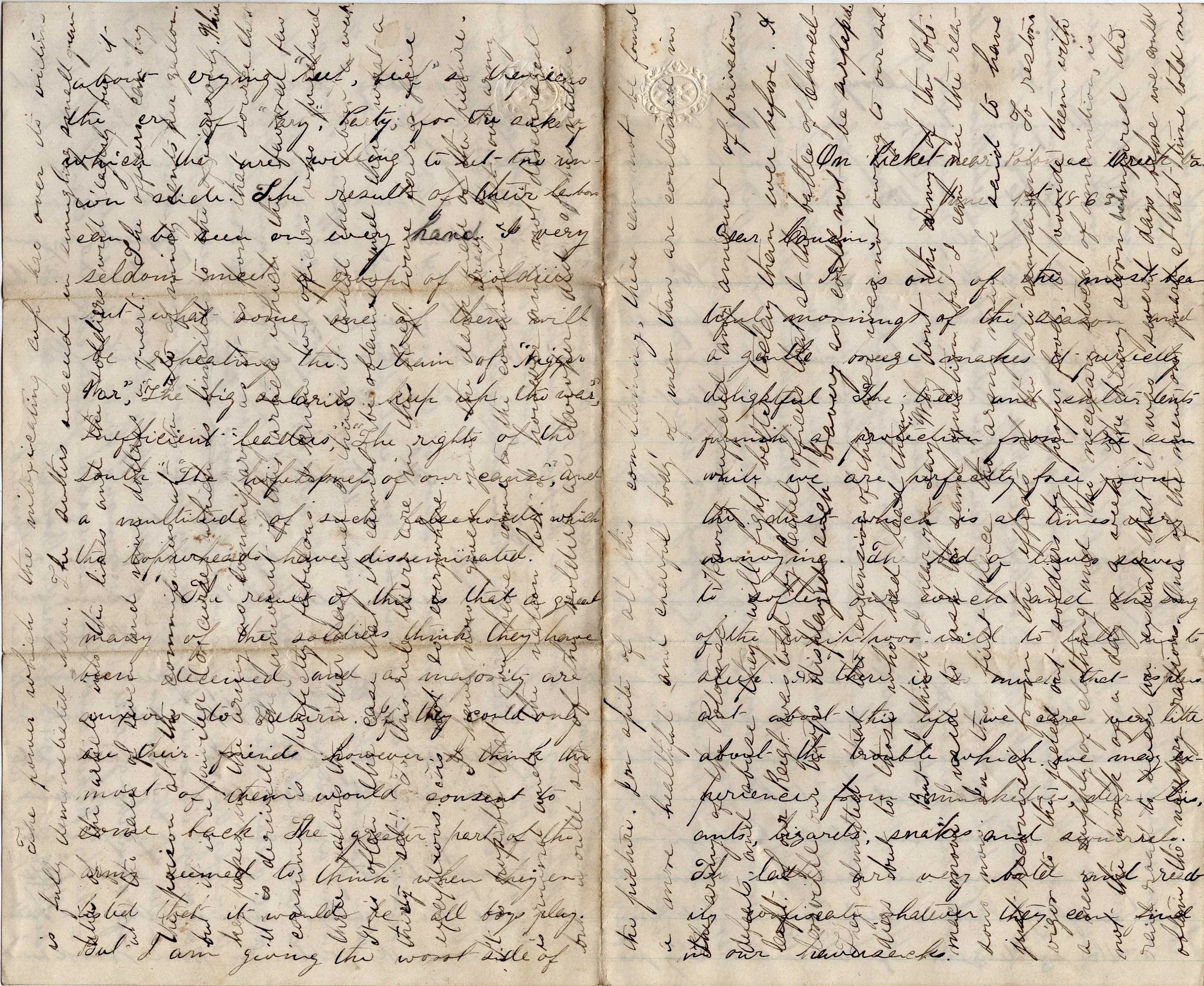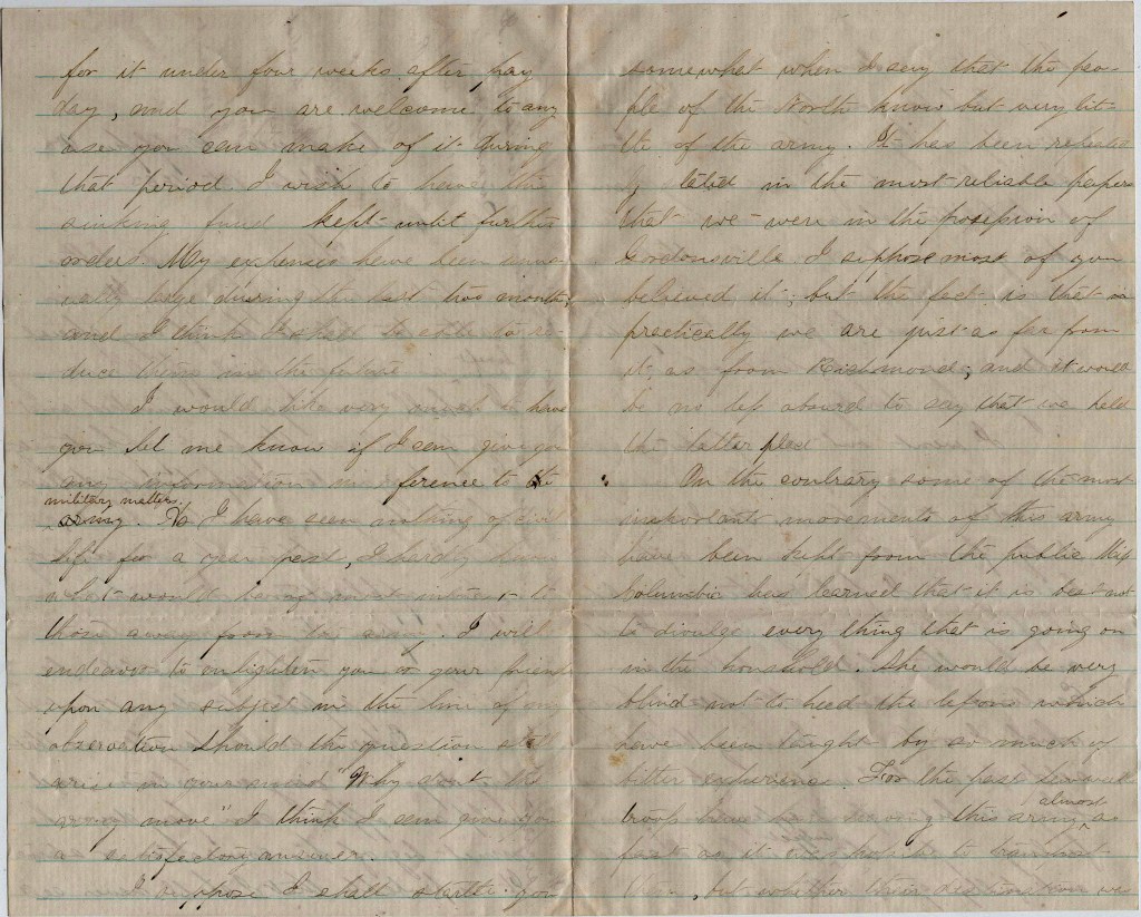 How do the people feel toward the soldiers? Our men think the office holders only want them for a handle, then will kick them aside after rising. The late frauds in soldiers’ votes goes strongly to confirm the idea. My opinion is that it is but little more than politics that keeps the war going. Rich contractors playing their points to rob the men of the Army supported by the Administration on the one side and gold gamblers sustained by Democratic papers and men on the other.