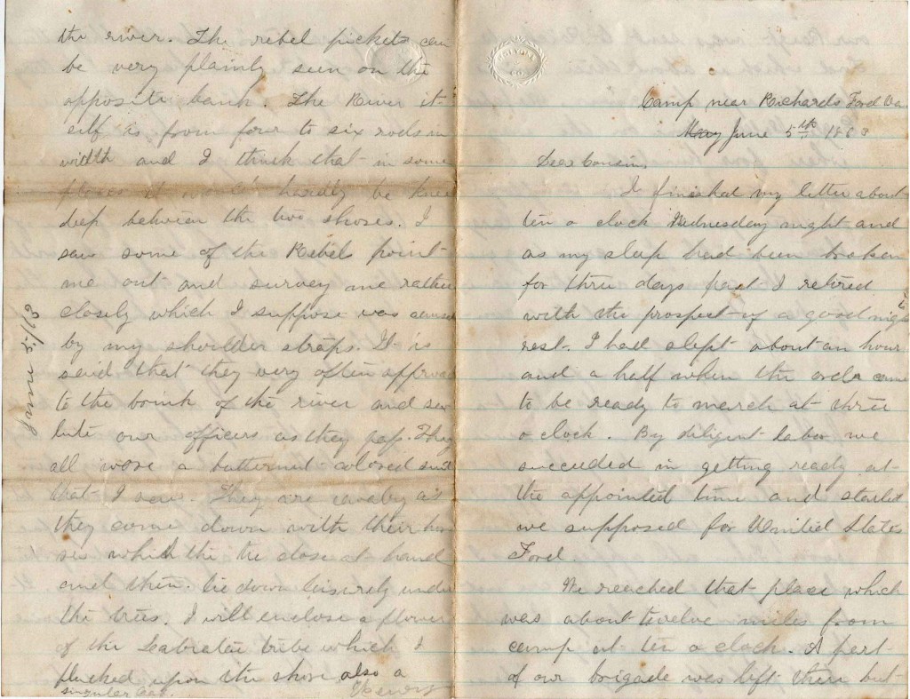 I was in the Battle of Bethesda Church and all through where we happened to be along the line of Lee’s army up to this place. We crossed the James river last Thursday about noon so we are now nearly south as near as I can judge from Richmond.