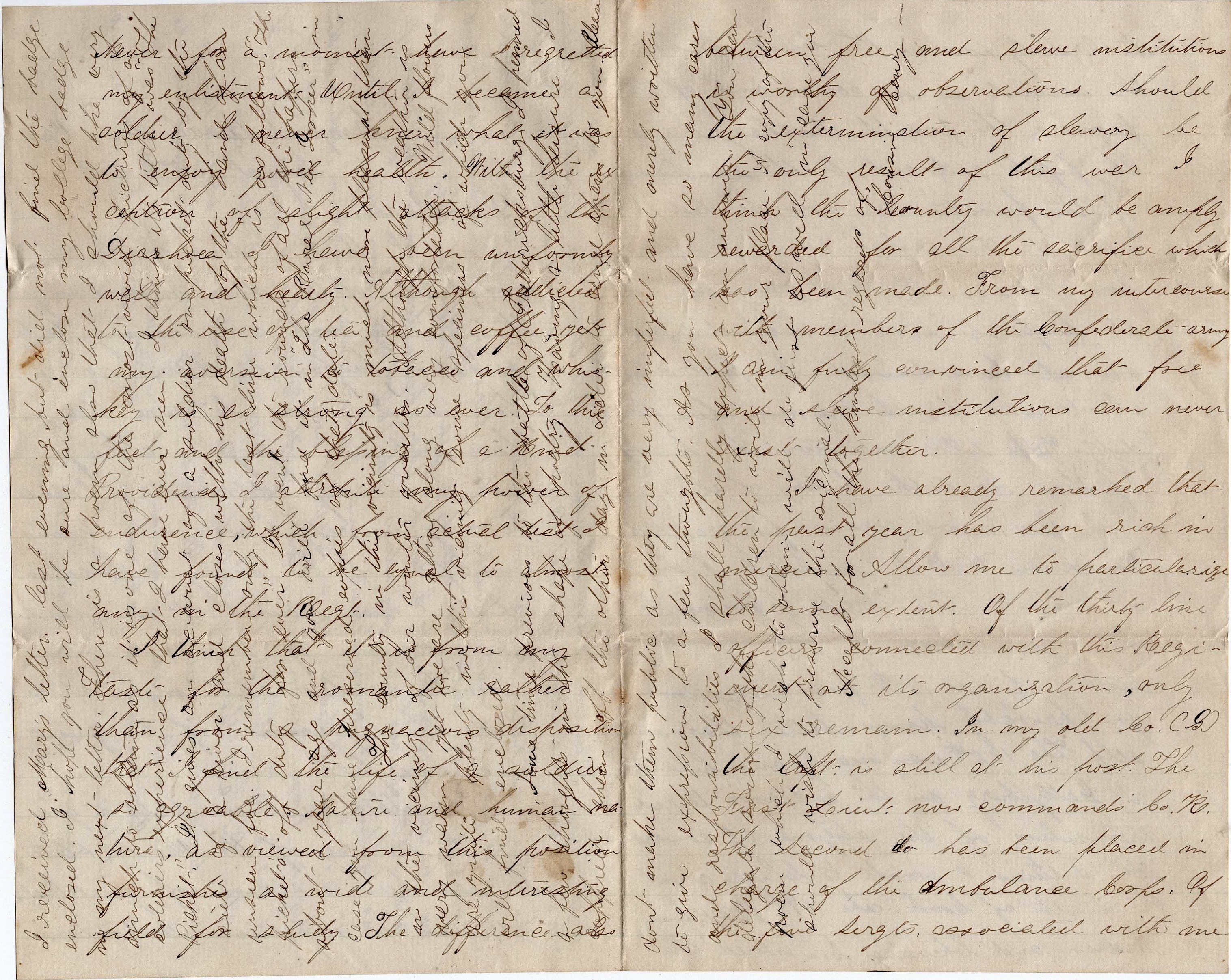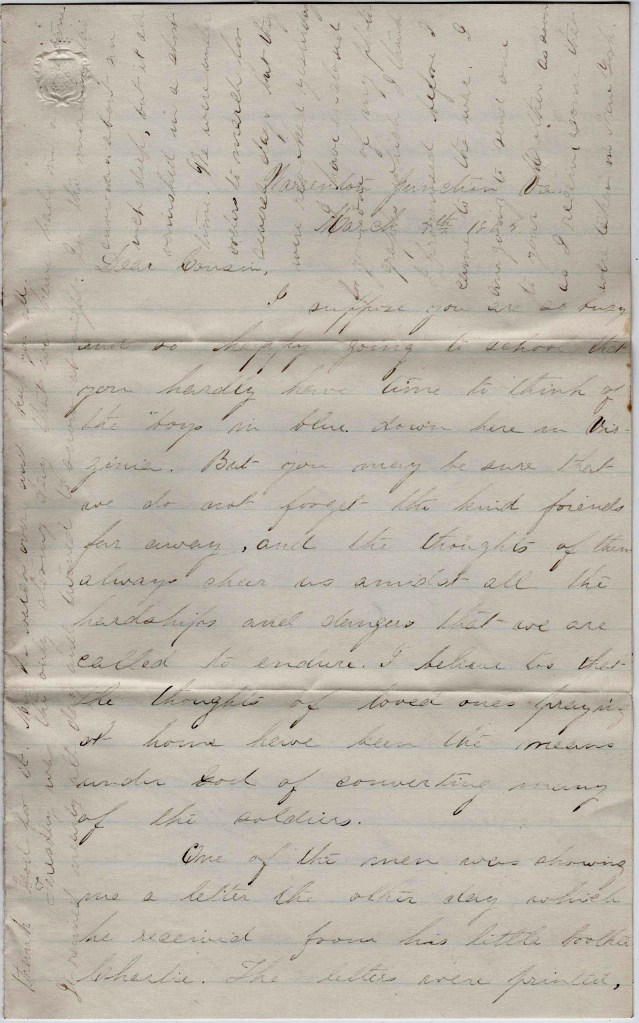 I will not write much on politics. If I do, I would not know when to stop until this sheet was filled. But I will say so far that I am for the Union and Old Abe with strong faith that he will be our next President. I do not know what you feel or think but it is cheering to me to think, if health permit, that we may be free once more and return to our home to look back at the last two years. To me it seems but a short space of time although we have seen some sad scenes in that time amongst our neighbors [and] friends. But the hopes that this war will soon come to a close and knowing I am on the last year of the term of my enlistment, I have got so I begin to count the months by and by. I am in hopes this war will come to an end before my term of enlistment is up, but we must cheer up, hoping all things will end well and soon.