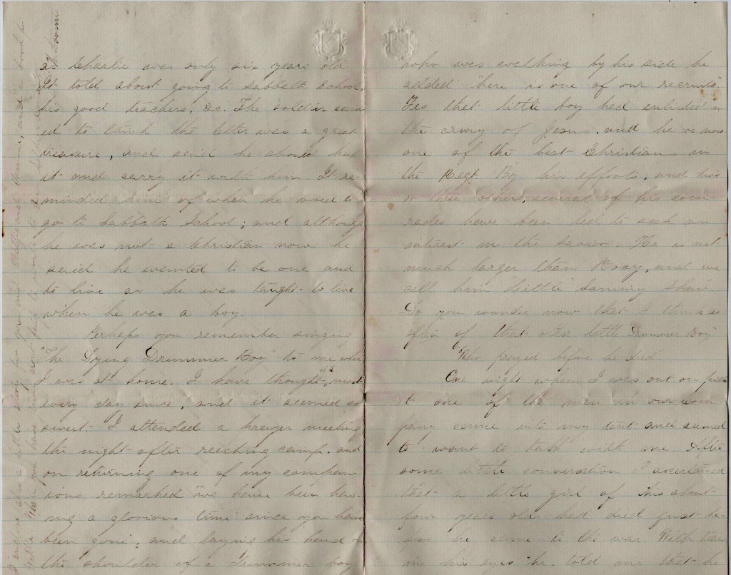 I went over to the Freedman’s Village last Sabbath and enjoyed my visit there very much. There was a Temperance Meeting for the colored children, and seventy of them signed the pledge. The children appeared much better than could be expected from those who had been subject to such treatment. They sang very well. In the afternoon a colored chaplain preached a sermon which would compare in every respect with some of the ablest preachers. I was fortunate enough to meet Mr. [H. E.] Simmons, the Principal, who showed me about the place and made it much more interesting. I think I shall go down and visit the school if we remain here much longer.