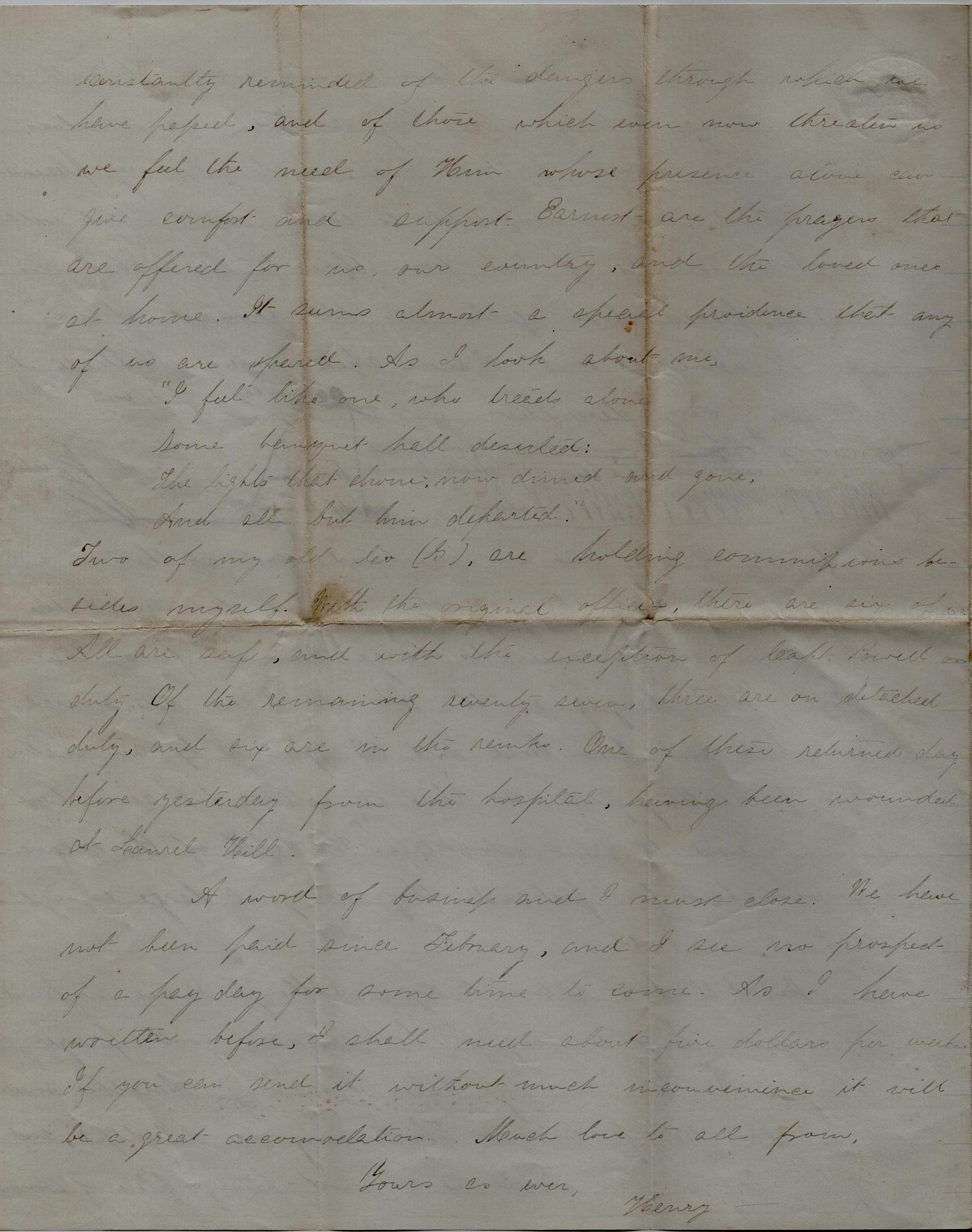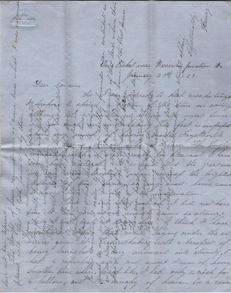 We have not seen Mr. Erdman yet. I suppose their regiment is somewhere about here but I do not know where. It is a very warm day and I am not in much of a mood for writing letters. Love to all, from cousin Henry