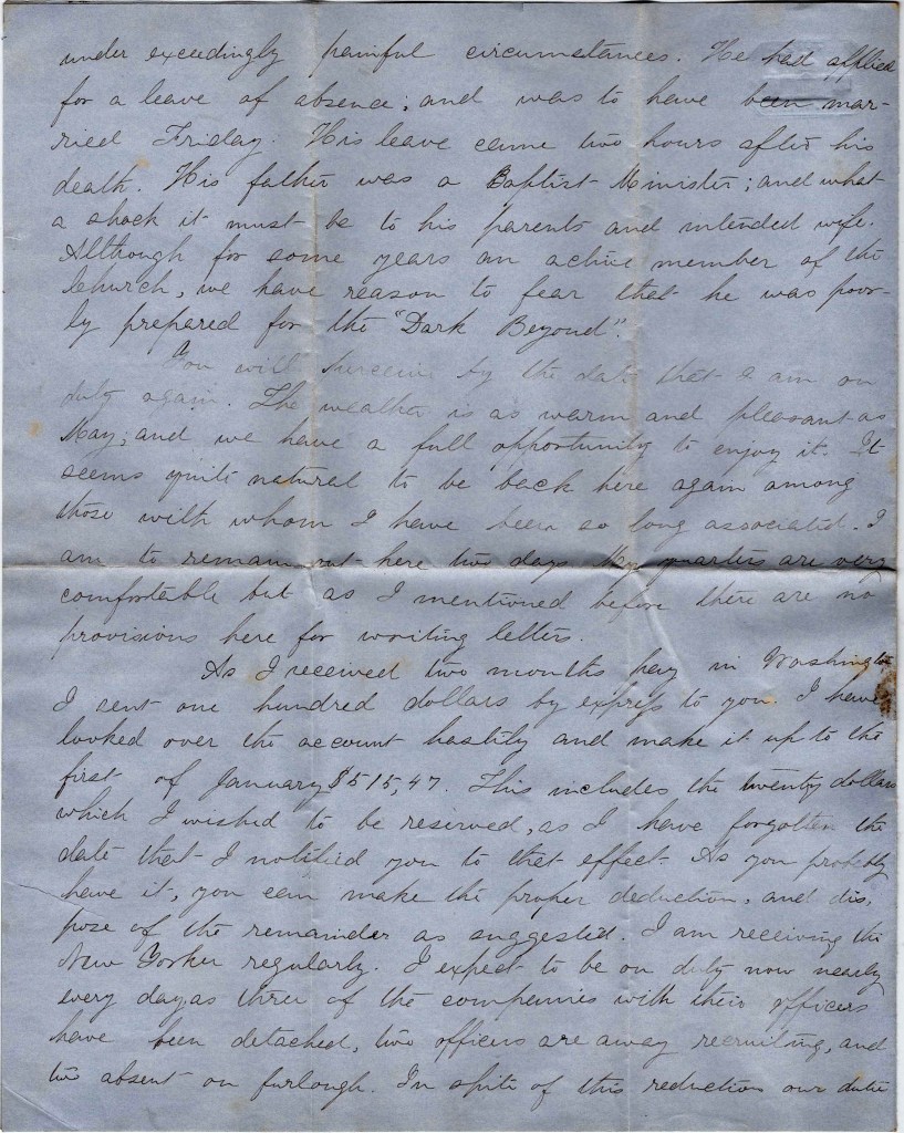 Mary’s letter containing twenty-five dollars reached me last night. It was very welcome as it is quite expensive living here. Our camp is but a short distance from the one we occupied in October/November 1862. We have a fine view from here of Washington, the Potomac, and surrounding scenery. I have not been to the city yet as we have so many papers to attend to.