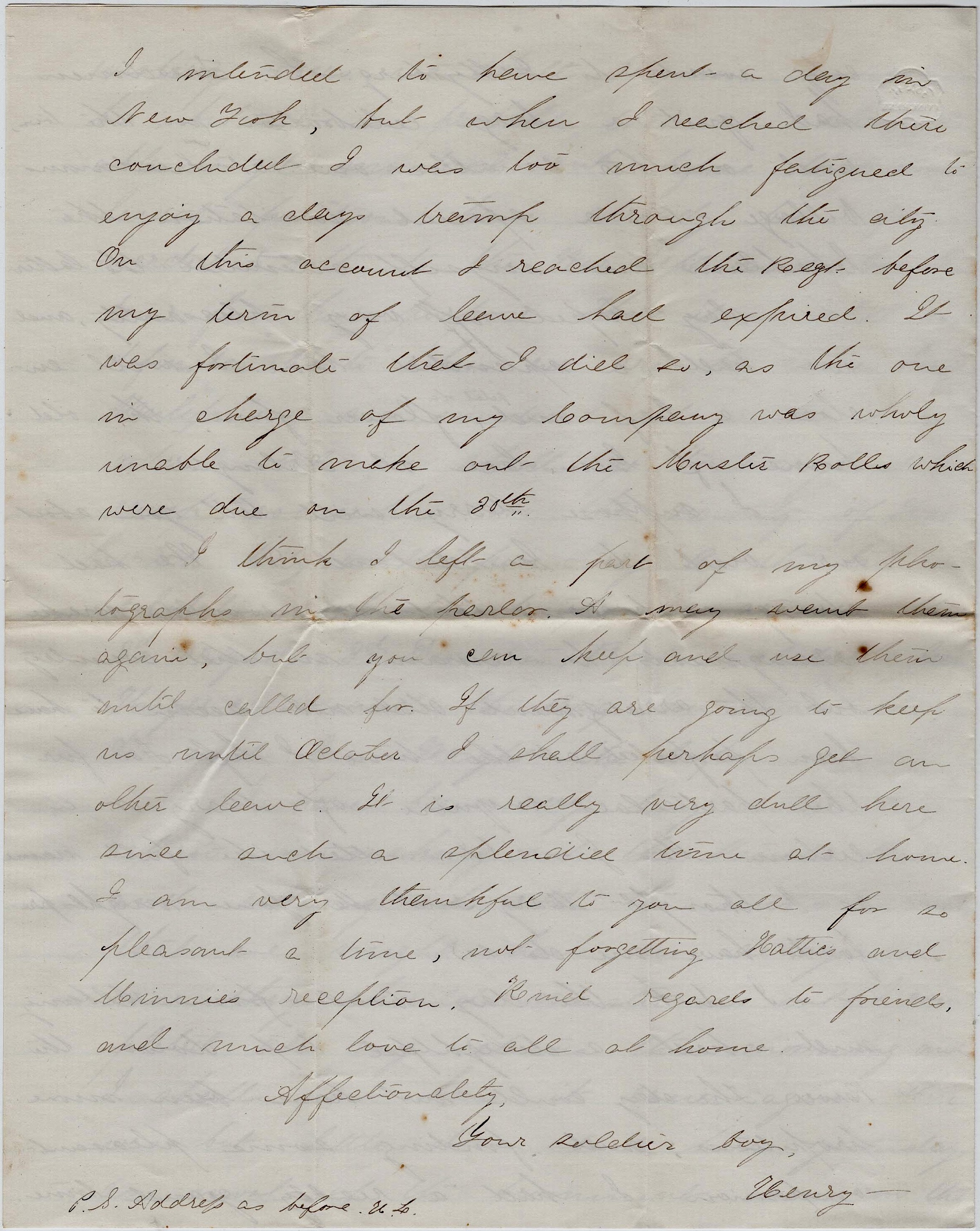 I think I left a part of my photographs in the parlor. I may want them again, but you can keep and use them until called for. If they are going to keep us until October, I shall probably get another leave. It is really very dull here since such a splendid time at home. I am very thankful to you all for so pleasant a time, not forgetting Hattie and Minnie’s reception. Kind regards to friends and much love to all at home. Affectionately, your soldier boy, – Henry