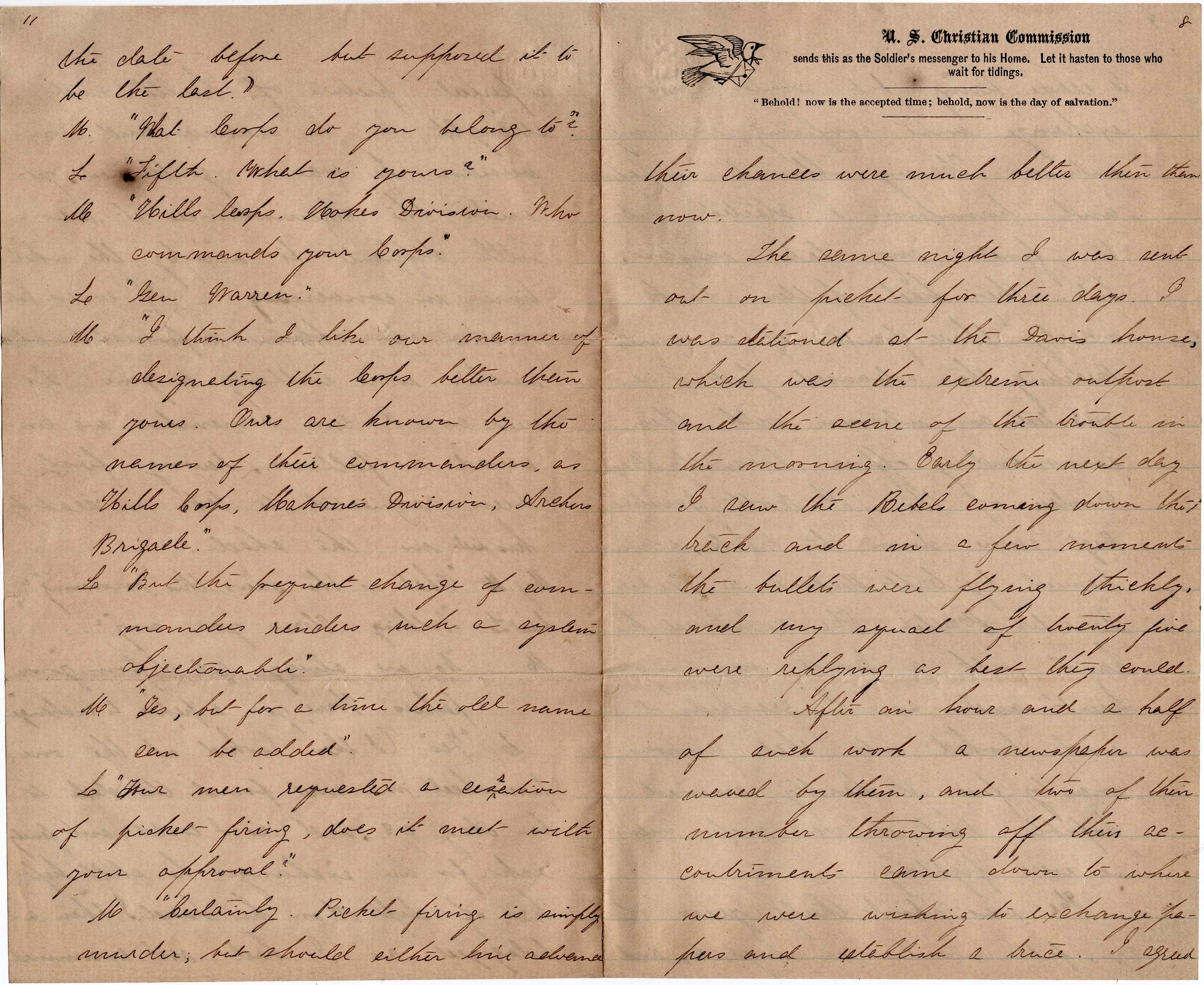 I commence to write to you with but little news but to comply with your request knowing you are always glad to hear the news from the Army of the Potomac, hoping these few lines will find you all well as it leaves me at present. We are having good fall weather—warm days—rather cool nights. We are doing picket duty where we have to be wide awake on both sides. They keep up a constant firing at times, just as much as if they was in line of battle, and other times they will cease for a few hours and the batteries will open on each other from the forts when we can see the shells very plain in the evening from both sides. Johnnies coming over to us and ours going over to them.