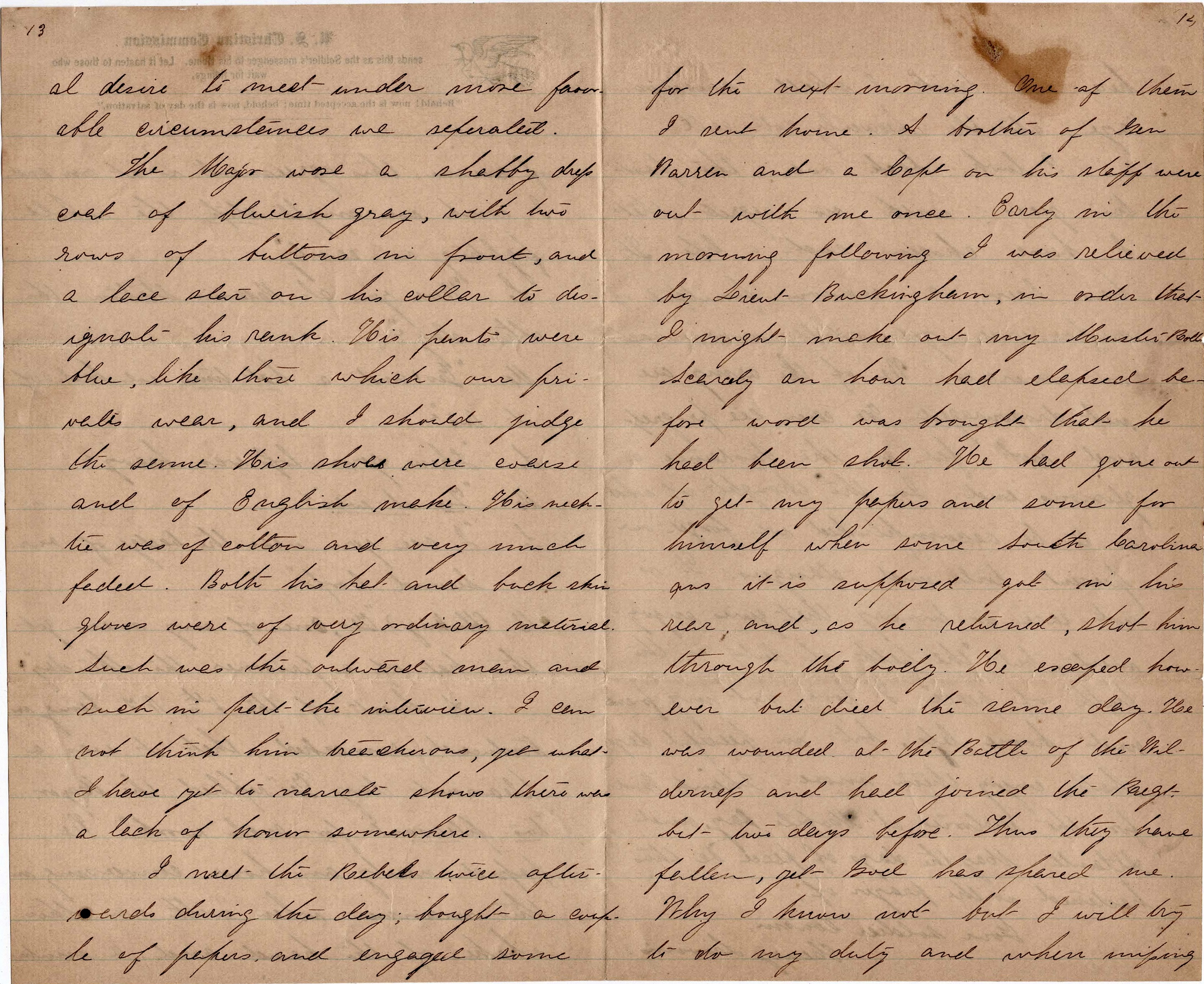 I met the Rebels twice afterwards during the day; bought a couple of papers and engaged some for the next morning. One of them I sent home. A brother of Gen. Warren and a Captain on his staff were out with me once. Early in the morning following. I was relieved by Lieut. [Charles L.] Buckingham [of Co. B] in order that I might make out my Muster Rolls. Scarcely an hour had elapsed before word was brought that he had been shot. He had gone out to get my papers and some for himself when some South Carolinians it is supposed got in his rear and, as he returned, shot him through the body. He escaped however but died the same day. 2 He was wounded at the Battle of the Wilderness and had joined the regiment but two days before. Thus they have fallen, yet God has spared me. Why I know not but I will try to do my duty and when missing here, I trust I shall answer “aye” at the heavenly roll call.